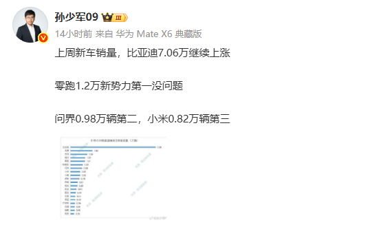 孙少军: 上周新车销量,比亚迪7.06万继续上涨!