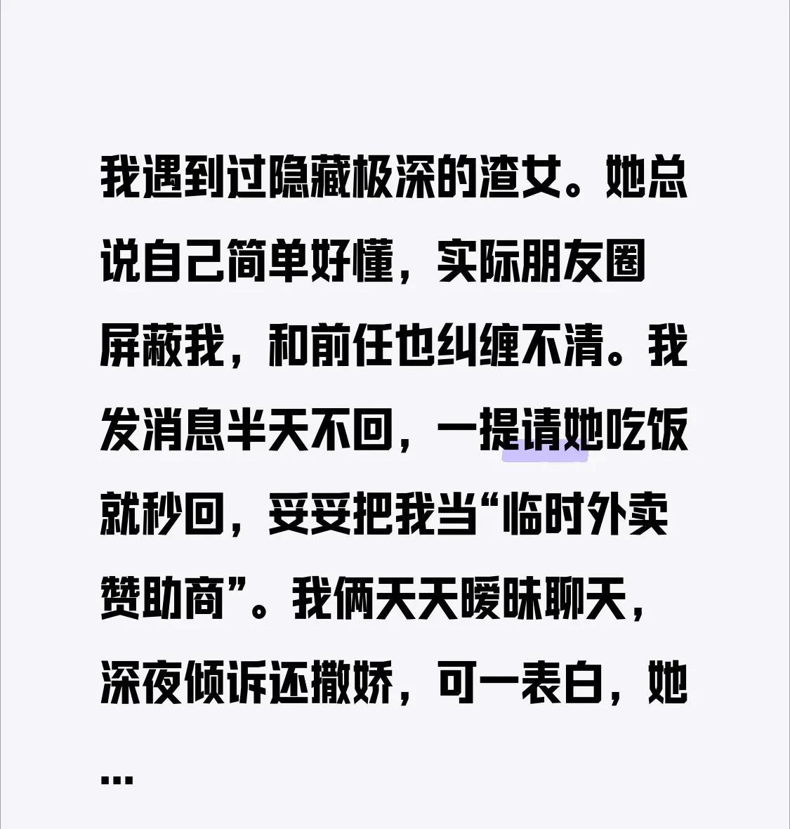 我遇到过隐藏极深的渣女。她总说自己简单好懂,实际朋友圈屏蔽我,和前任也纠缠不清。我发消息半天不回,一提请她吃饭就秒回,妥妥把我当“临时外卖赞助商”。 我俩天天暧昧聊天,深夜倾诉还撒娇,可一表白,她就说不想谈恋爱,转头又在朋友圈和别人互动亲密。质问她,她还理直气壮说我没资格管。这种玩弄感情、套路满满的渣女,真让人防不胜防。