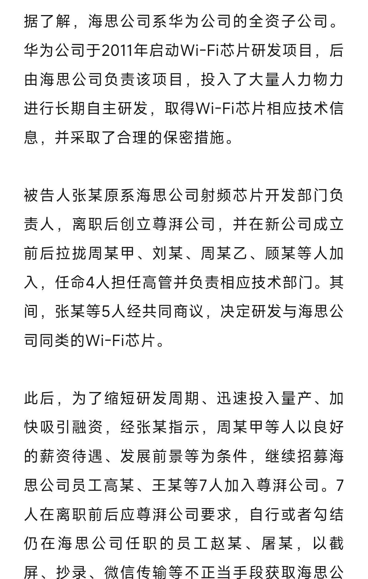 最高检: 尊湃侵犯华为海思芯片技术商业秘密案一审判决生效。 14名被告人10日内均未提起上诉。 14名离职技术人员非法获取技术信息估值超3亿。 - 张某被判处有期徒刑六年,并处罚金300万元。 - 周某甲、刘某、周某乙、顾某被分别判处有期徒刑五年至三年,并处罚金150万元至120万元不等。 - 高某、王某等9人被判处有期徒刑并宣告缓刑,并处罚金100万元至20万元不等。