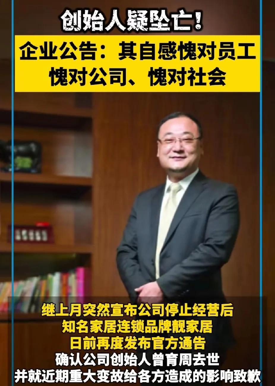 又一位坠亡,今年的企业家们是怎么了。 继居然之家董事长兼ceo汪林朋,西子电梯董事长兼总经理刘文超,浙江省建设投资集团股份有限公司副总经济师沈康明,又一知名建筑行业知名企业靓家居董事长曾寓周也被曝坠楼而亡。 透露其根本原因还是因为公司经营上的问题。 是因为整个建筑行业的下行,让公司资金链断裂,从而陷入泥潭负债累累,特别是贷款的利息让他感觉喘不过来气。 内心极度痛苦的他感觉愧对员工,愧对公司,愧对股东,愧对社会,所以才选择了这种极端的方式。 虽然我们素未谋面,但是作为同行祝您一路走好。 同时也希望各位企业家在公司遇到困难的时候不要气馁,毕竟你们人脉广资源多,比普通人有更多翻身的机会,好好活着才有东山再起的机会。#民营企业家坠楼# #汪林朋坠楼# #高管坠楼# #国企设计师坠亡#