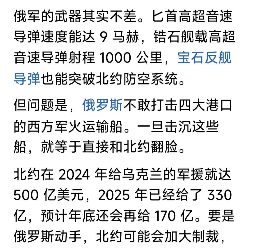 看过这篇文,苍狼犯嘀咕:俄为何不炸乌外援港口与运输线?网友报道,乌接受外援通道,主要有“四港两线”: “四港”指乌现在四个重要港口:南方港,黑海港,雷尼港与敖德萨港。主要接受来自美欧G7五眼海运援助物资。 “两线”指欧洲经由波兰与罗马尼亚,通往乌克兰的铁路公路与空中航线。主要接受北约欧盟G7五眼武器弹药。 报道称乌“四大港口”中,以敖德萨港最忙。仅8月就有120艘美欧货轮进出,为乌输送军工军火武器弹药等。 两条“空陆运输”通道,以波乌线为主,罗乌线为辅。波兰热舒夫空军机场,每周至少8架次美军大型运输机降落,其他北约国家,还有超过15架次。 这些运输机载重量80吨。每周超20多架次,能运多少武器弹药?这只是波乌线数字,还有罗乌线呢!这些装备卸下飞机,再经铁路公路输送至乌。 正是由乌“四大港口”“两条通道”,源源不断接受美欧北约,G7五眼的军事援助,才让乌有底气与俄抗争啊! 苍狼有点不解的是:乌“四大港口”就摆在那里,还有“波乌”“罗乌”两条陆地援乌物资运输线,俄为什么不炸呢? 是严密监控之下,战机无法出动轰炸?还是导弹生产跟不上,导致数量不够?或者是缺少远程无人机?对美欧援乌船只与飞机不敢打,怕事情闹大? 这种“狗咬狼两害怕”,造成俄乌双方的“消耗战”!目前战争已打三年,两国各自伤亡百万,损耗物资无计。若不能停战,继续打下去还要损耗多少? 目前双方仍在较劲!普皇希望美欧首先挺不住,减少援乌导致其崩溃!美欧支持乌打击俄纵深目标,甚至不排除进一步严厉制裁,造成俄经济崩溃? 目前看局势进展,双方想实现目标都不容易!停战实现不了,只能继续打?战争手段加制裁,能解决问题吗? …………