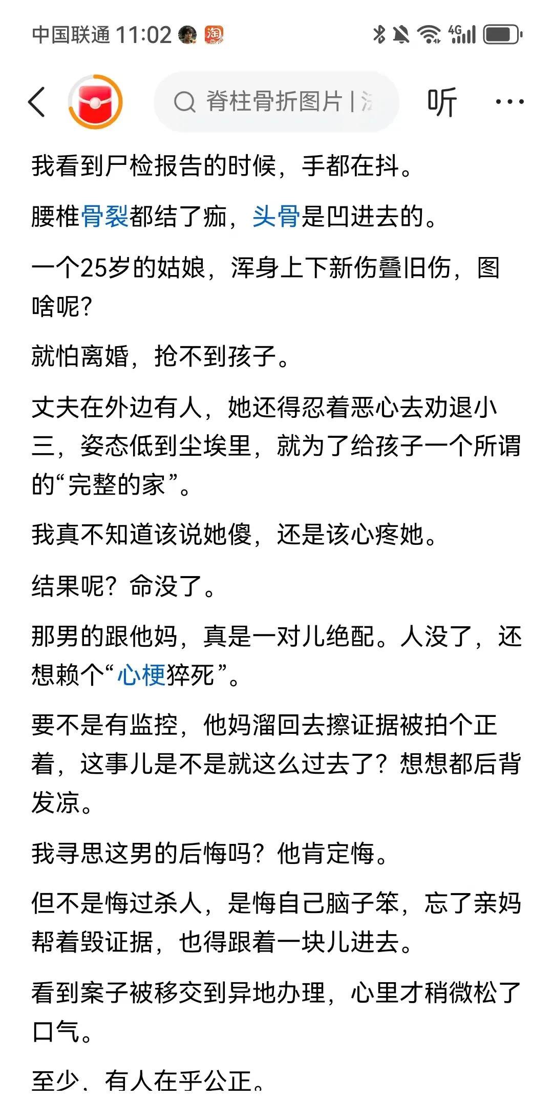 看到尸检报告的时候,手都在抖。伤的太深太惨,看后心里阴阴的疼,家长心里的疼是无法找到语言表达的。 孩子争不到,长大后会来认自己的母亲的,傻女人,自己没命,孩子怎么办。 这女的也太傻了,为了孩子忍家暴、凑完整家,结果命都没了!那男的和他妈真不是人,必须重判,孩子可别再跟他们沾边了! 杀人偿命,姑娘下辈子找对象一定要擦亮眼睛,找个疼自己的人。 男方家争夺孩子抚养权不是爱孩子,是因为有未成年人需要抚养,死刑量刑会有考虑。 这种尺度拍成电影都未必让播的,居然在我们身边真真切切的发生。天苍苍地茫茫,有钱有势知法犯法一桩又一桩!