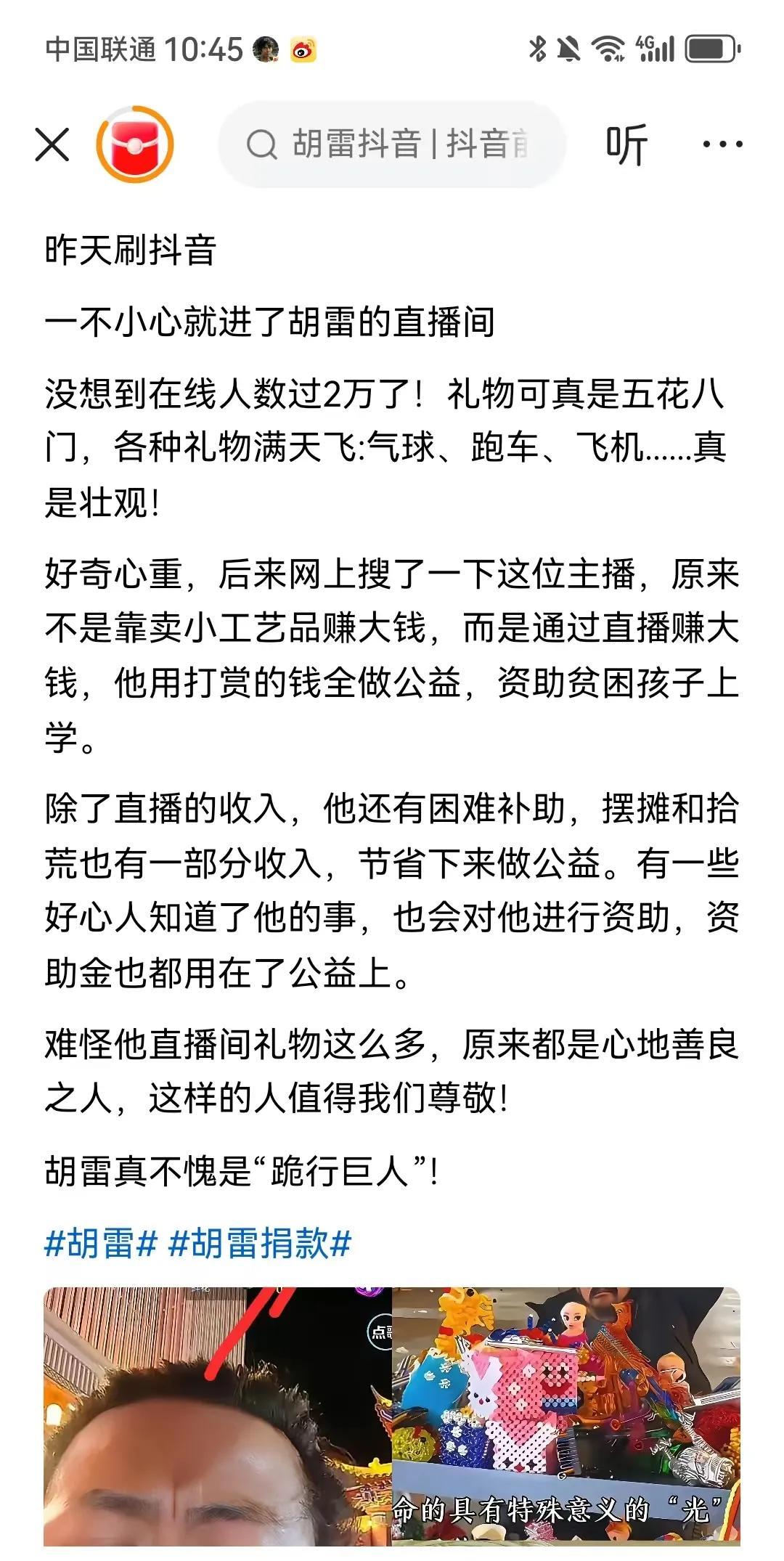 胡磊那天说孩子的家人包括他爷爷奶奶都很好,这么明显的谎言谁信?他在掩盖什么,还是团队后面有人教他怎么说?他一个人卖货的渠道,有钱捐助没钱打理自己? 咿咿呀呀的,一看就不是善茬,残疾人心理上一般不健康,特别是光棍汉残疾人。 为什么他捐助不通过当地民政部门,以及学校进行?他非要拉着小姑娘的手,一边哭丧着脸,一边对小姑娘说那些对她家庭挑拨离间的话? 说什么,没有人关心你,还有叔叔我?最起码你得装个人模人样,把头发剪了,找件干净的衣服,才不至于让其他小孩子对小姑娘耻笑和嘲讽! 演戏也得注意形象,挣流量也得选择好对象。她只是一个小孩子,就是成年人都觉得无地自容。