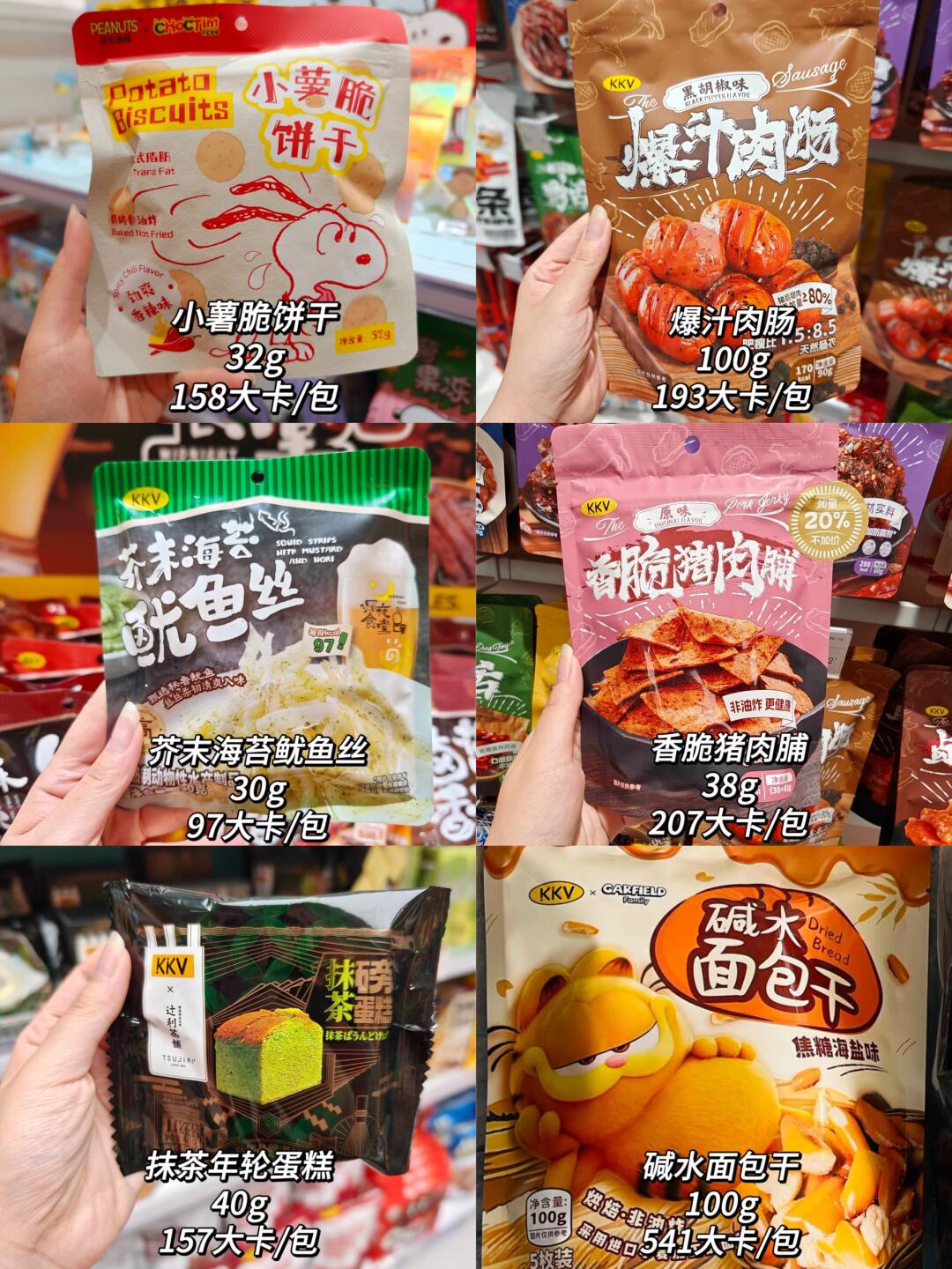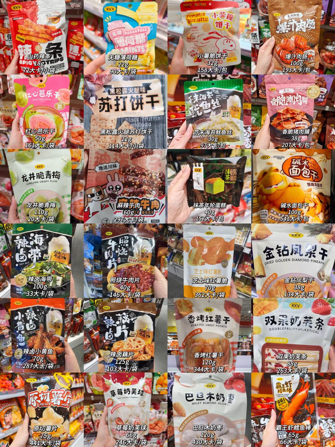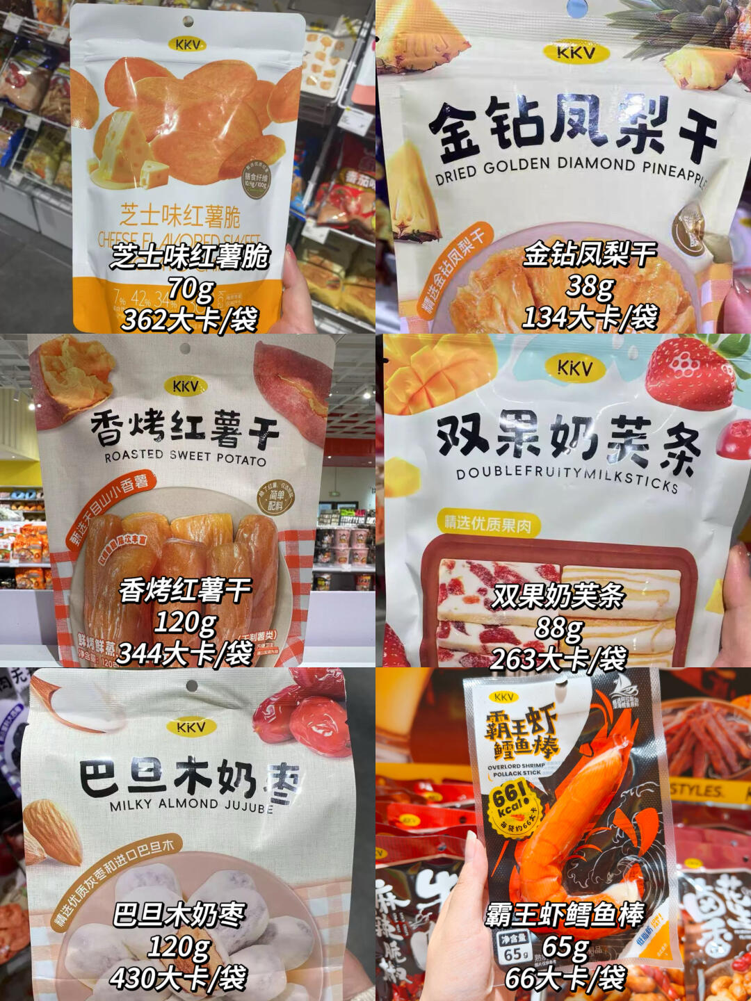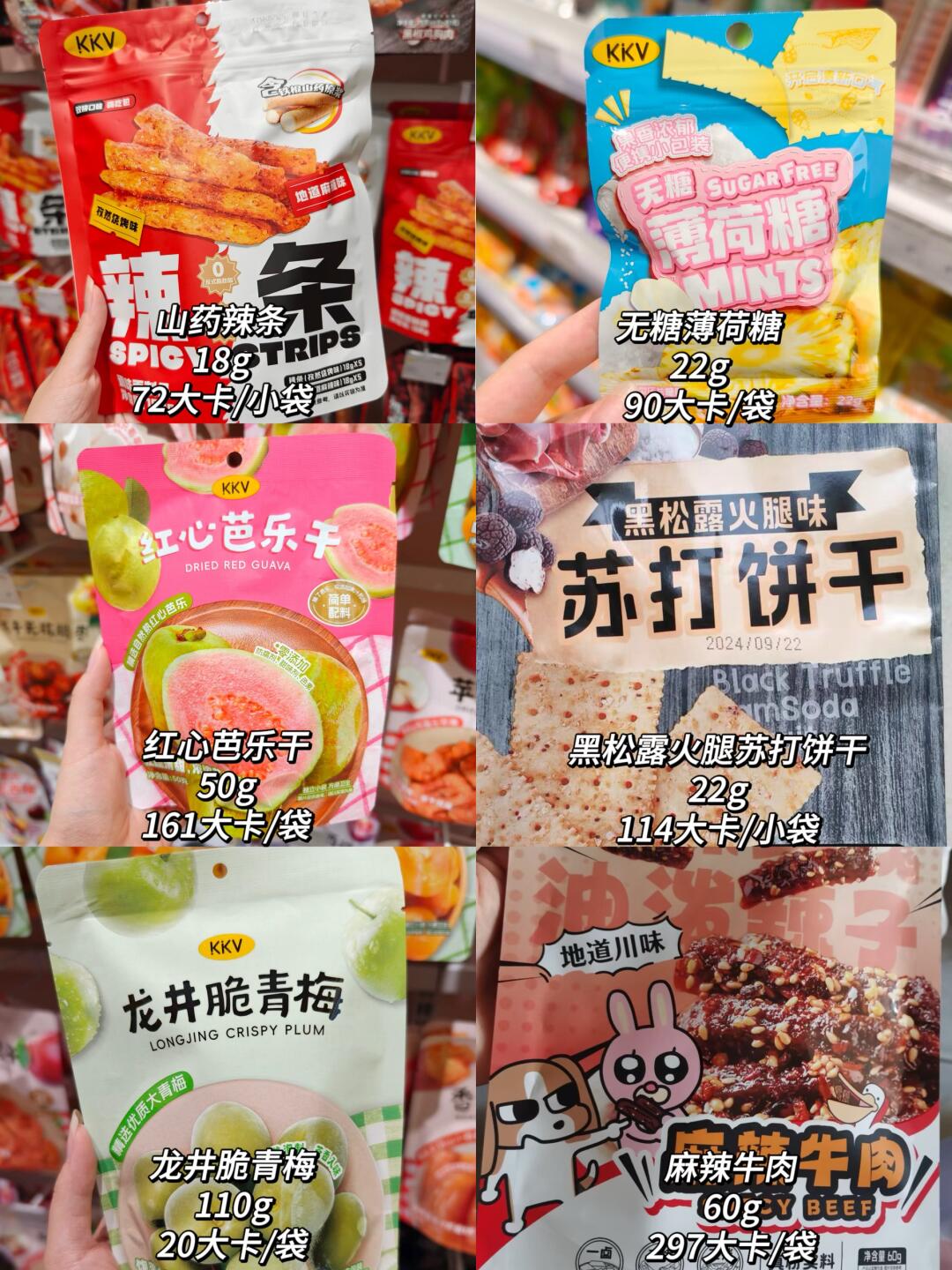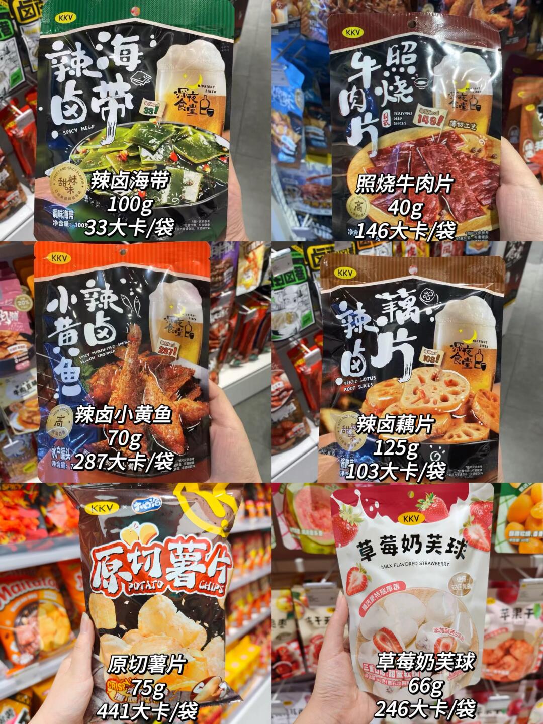 hello 大家好🙋 我是莹莹 一个喜欢研究外食不长胖的女孩👧 今天测评的是kkv的零食 看下他们的热量都有多少吧~ 【0-100大卡】(从低到高) 1️⃣龙井脆青梅20大卡/袋 2️⃣辣卤海带33大卡/袋 3️⃣霸王虾鳕鱼棒66大卡/包 4️⃣山药辣条72大卡/袋 5️⃣无糖薄荷糖90大卡/袋 6️⃣芥末海苔鱿鱼丝97大卡/包 7️⃣辣卤藕片104大卡/袋 【100大卡以上】 1️⃣黑松露苏打饼干114大卡/袋 2️⃣金钻凤梨干134大卡/袋 3️⃣照烧牛肉片146大卡/袋 4️⃣抹茶年轮蛋糕157大卡/袋 5️⃣小薯脆饼干158大卡/袋 6️⃣红心芭乐干161大卡/袋 7️⃣爆汁肉肠193大卡/袋 8️⃣香脆猪肉脯207大卡/袋 9️⃣双果奶芙条263大卡/袋 🔟草莓奶芙球246大卡/袋 1️⃣1️⃣辣卤小黄鱼287大卡/袋 1️⃣2️⃣麻辣牛肉297大卡/袋 1️⃣3️⃣香烤红薯干344大卡/袋 1️⃣4️⃣芝士红薯脆362大卡/袋 1️⃣5️⃣巴旦木奶枣430大卡/袋 1️⃣6️⃣原切薯片441大卡/袋 1️⃣7️⃣碱水面包干541大卡/袋 ✅除了日常知道的海带藕片低热量外!我还发现青梅、鱿鱼丝、薄荷糖、鳕鱼棒、水果干小包装的整体热量也不会很好适合下午当加餐来吃!像那种很大包装一看就是油炸/重口的就需要控制一下热量啦! 好啦,本期的分享就到这里啦 我们下期再见👋