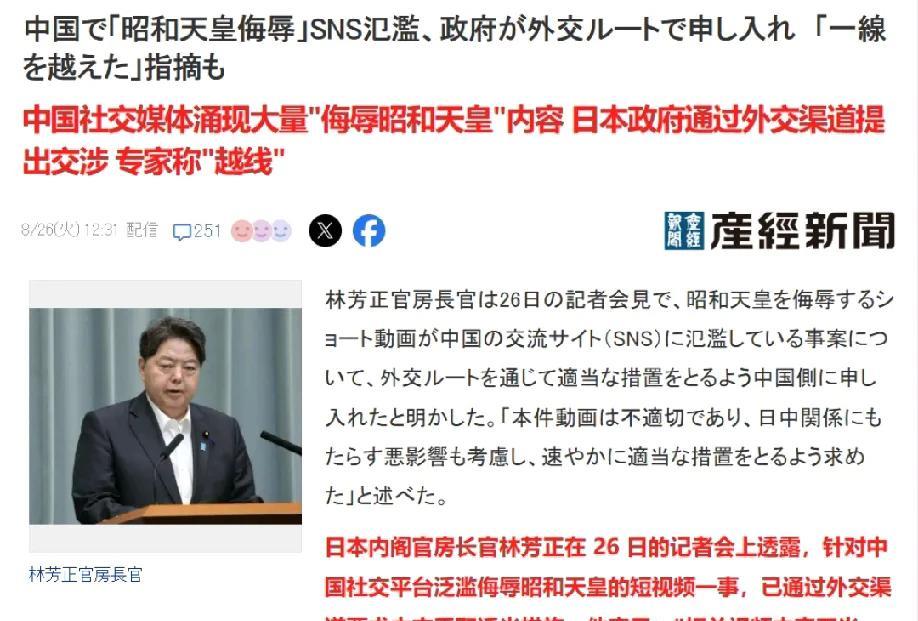 8月27日,日媒报道称:“九三大阅兵前夕,大陆社媒出现疑似AI生成的昭和天皇的视频,内容涉及不雅画面,在抖音、小红书等平台传播,日方通过外交渠道向中方交涉,要求尽快采取适当措施,林芳正称此举不恰,担忧影响中日关系,中方表示相关情况正在调查中,部分视频已被删除,此外,东京还呼吁欧亚各国不参加北京阅兵及相关活动,中方已就此向日方提出交涉,要求澄清,事件对中日关系的影响仍待观察。”