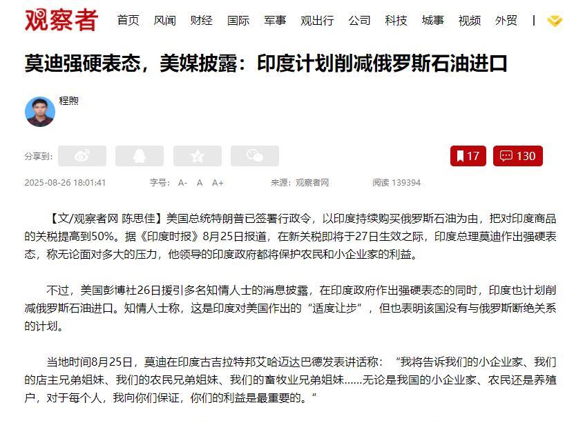 莫迪刚对着印度老百姓拍着胸脯喊“天大的压力也保你们饭碗”,转头就被美媒扒出要悄悄砍俄罗斯石油进口,这反差也太让人看懵了!前几天他还在演讲里硬气十足,说绝不会让农民、小老板受委屈,结果这边话音刚落,就有消息说印度打算从10月起少买俄油,每天比之前少几十万桶。 明眼人都看出来,这是怕美国的高关税砸了出口的锅,可又不想彻底得罪俄罗斯,印度这夹在中间的纠结劲儿,接下来的日子怕是更不好过。 印度现在挺头疼的——国内不少厂子,像做皮革、搞纺织的,往美国的订单黄了不少,就因为美国把关税提得老高。 为啥美国要这么干?说白了就是不爽印度买俄罗斯的便宜油。印度也难啊:不买俄油,自己买油得花更多钱;买了,美国又拿关税当大棒敲它。 所以最近有消息说,印度打算少买点儿俄油了,每天比之前少几十万桶,但没彻底断。 这其实就是给美国个台阶,不想把关系闹太僵,可也没傻到跟俄罗斯彻底掰了——毕竟俄油便宜,还能从俄罗斯买武器,断了对自己没好处。 莫迪之前对着老百姓拍胸脯,说肯定护好大家的饭碗,其实就是怕国内人不满。 农民、小老板是他的基本盘,要是让大伙觉得政府向美国低头不管他们,麻烦就大了。 有意思的是,印度少买的俄油,不少被中国接了过去,美国却装没看见——它现在一门心思逼印度让步,犯不着再去惹中国,怕分身乏术。 其实这事儿说白了,印度就是夹在大国中间难做人:两边都想不得罪,还想保住自己的好处。 但国际上哪有那么好的事儿?不管是现在少买俄油,还是哄着国内老百姓,都是暂时的办法。 真要想不这么憋屈,最终还得靠自己硬气——比如国内产业能支棱起来,不用指着美国市场吃饭。 能源来源能多点儿,不用在俄油上纠结。毕竟在国际上混,实力才是真底气,不然再怎么平衡,也还是要看别人脸色。