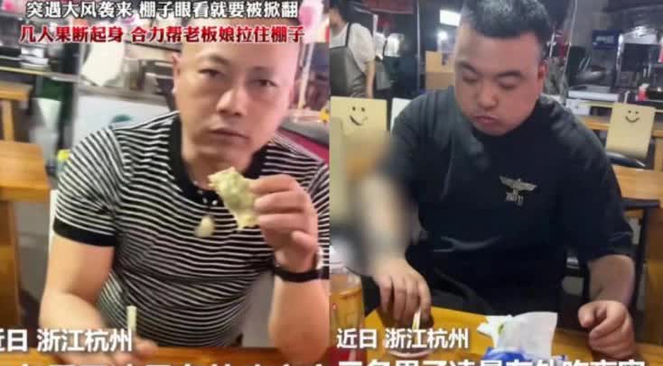 “火到人民日报了!”浙江杭州,3名男子正在吃宵夜,突遇大风来袭,棚子眼看就要被掀