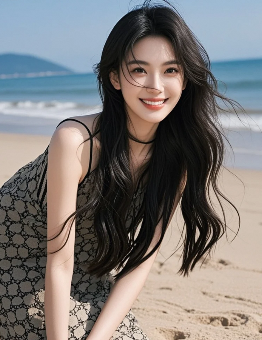 宁静沙滩上,长发与海风共绘一幅诗意浪漫图景
