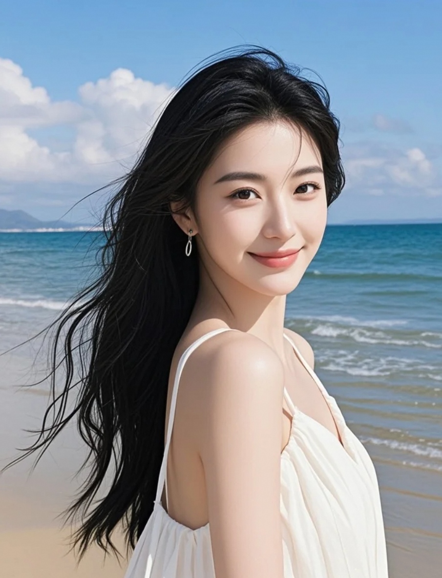 沙滩漫步的女神,长发飞扬,笑容温婉,画面充满故事感