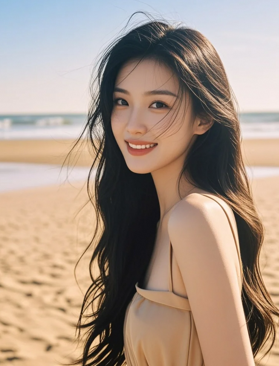 沙滩上的大明星,长发飘逸,笑容清新,姿态优雅动人