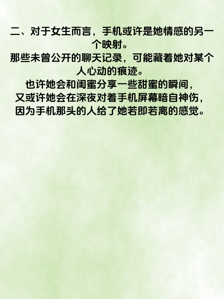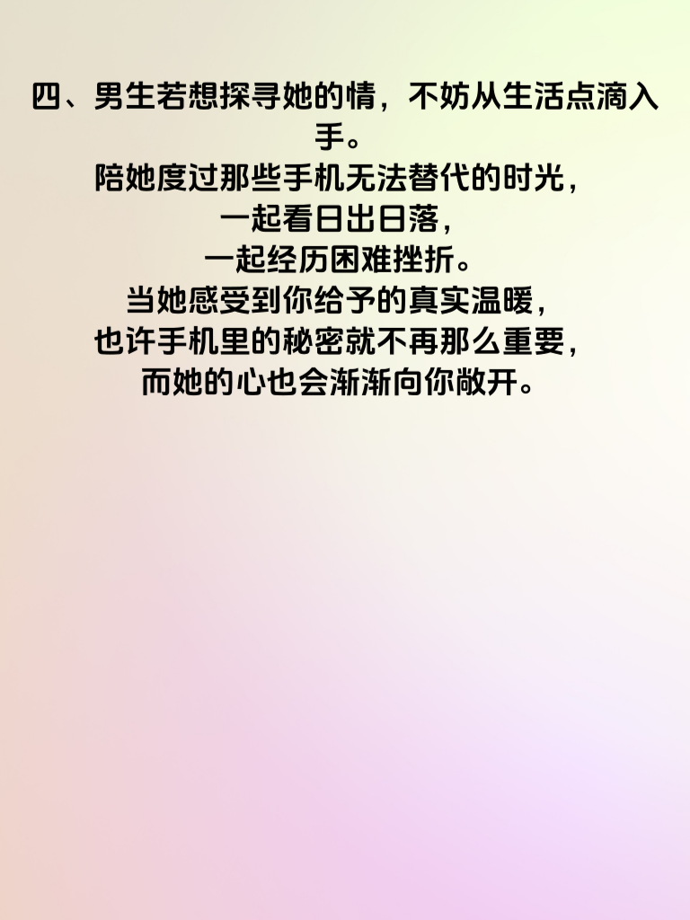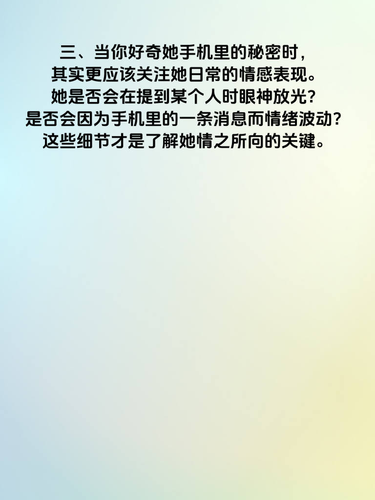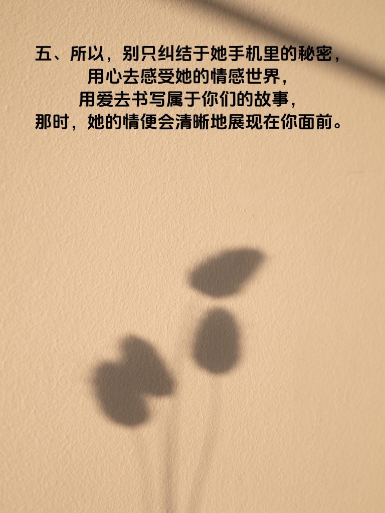 一、手机,这个小小的物件,如今却仿佛成了人们内心秘密的保险箱。她的手机里藏着秘密,那其中又藏着怎样关于情的故事呢? 二、对于女生而言,手机或许是她情感的另一个映射。那些未曾公开的聊天记录,可能藏着她对某个人心动的痕迹。也许她会和闺蜜分享一些甜蜜的瞬间,又或许她会在深夜对着手机屏幕暗自神伤,因为手机那头的人给了她若即若离的感觉。 三、当你好奇她手机里的秘密时,其实更应该关注她日常的情感表现。她是否会在提到某个人时眼神放光?是否会因为手机里的一条消息而情绪波动?这些细节才是了解她情之所向的关键。 四、男生若想探寻她的情,不妨从生活点滴入手。陪她度过那些手机无法替代的时光,一起看日出日落,一起经历困难挫折。当她感受到你给予的真实温暖,也许手机里的秘密就不再那么重要,而她的心也会渐渐向你敞开。 五、所以,别只纠结于她手机里的秘密,用心去感受她的情感世界,用爱去书写属于你们的故事,那时,她的情便会清晰地展现在你面前。