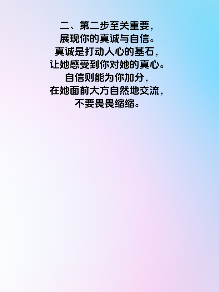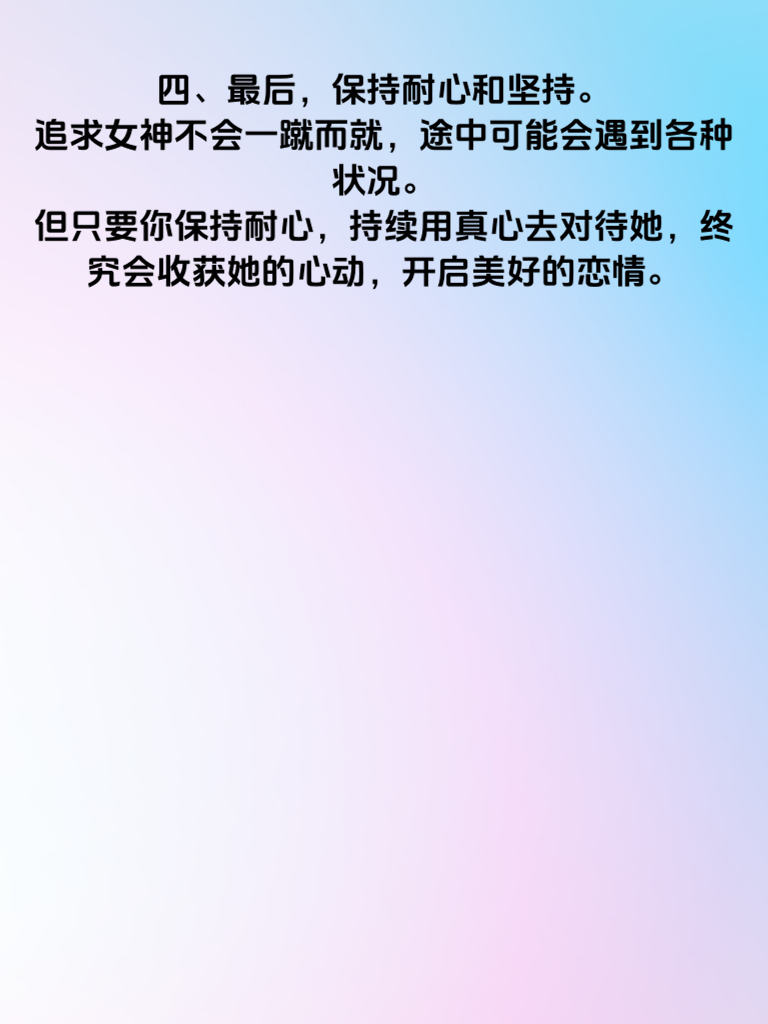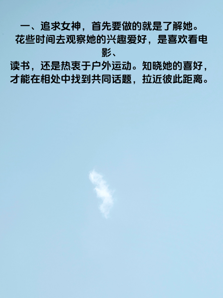 一、追求女神,首先要做的就是了解她。花些时间去观察她的兴趣爱好,是喜欢看电影、读书,还是热衷于户外运动。知晓她的喜好,才能在相处中找到共同话题,拉近彼此距离。 二、第二步至关重要,展现你的真诚与自信。真诚是打动人心的基石,让她感受到你对她的真心。自信则能为你加分,在她面前大方自然地交流,不要畏畏缩缩。 三、制造一些浪漫的小惊喜也必不可少。不需要多么昂贵奢华,一束她喜欢的小花,或者一份亲手做的小点心,都能让她心里泛起涟漪,感受到你的用心。 四、最后,保持耐心和坚持。追求女神不会一蹴而就,途中可能会遇到各种状况。但只要你保持耐心,持续用真心去对待她,终究会收获她的心动,开启美好的恋情。