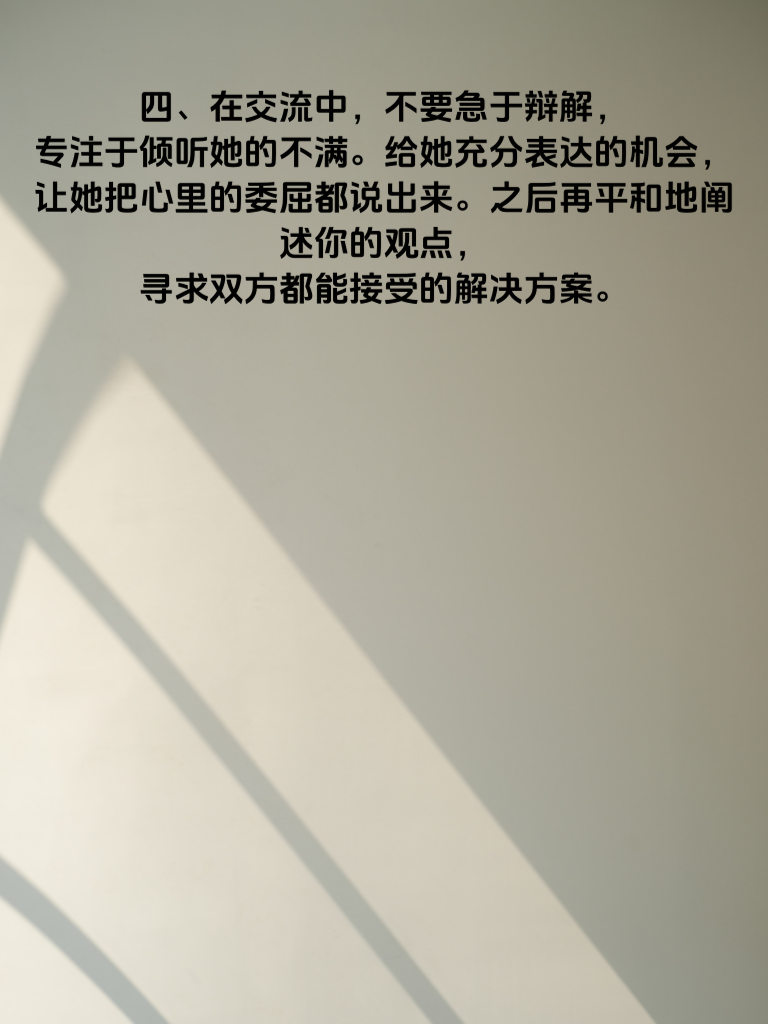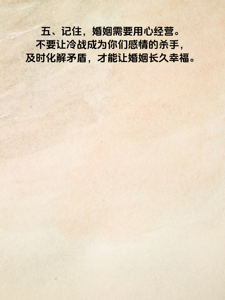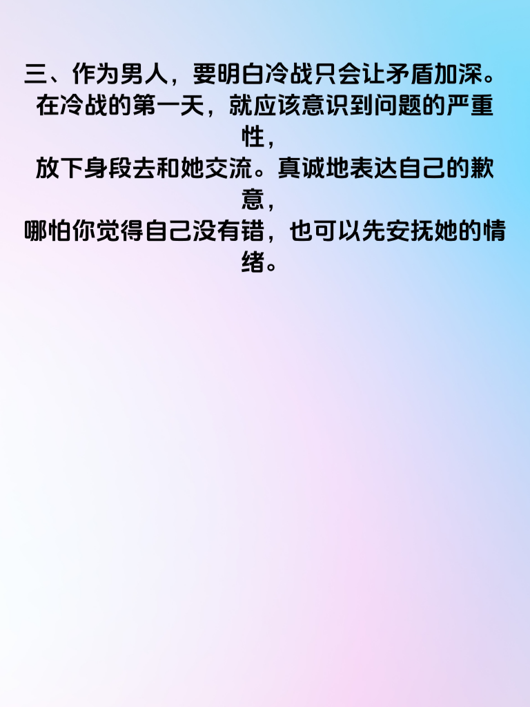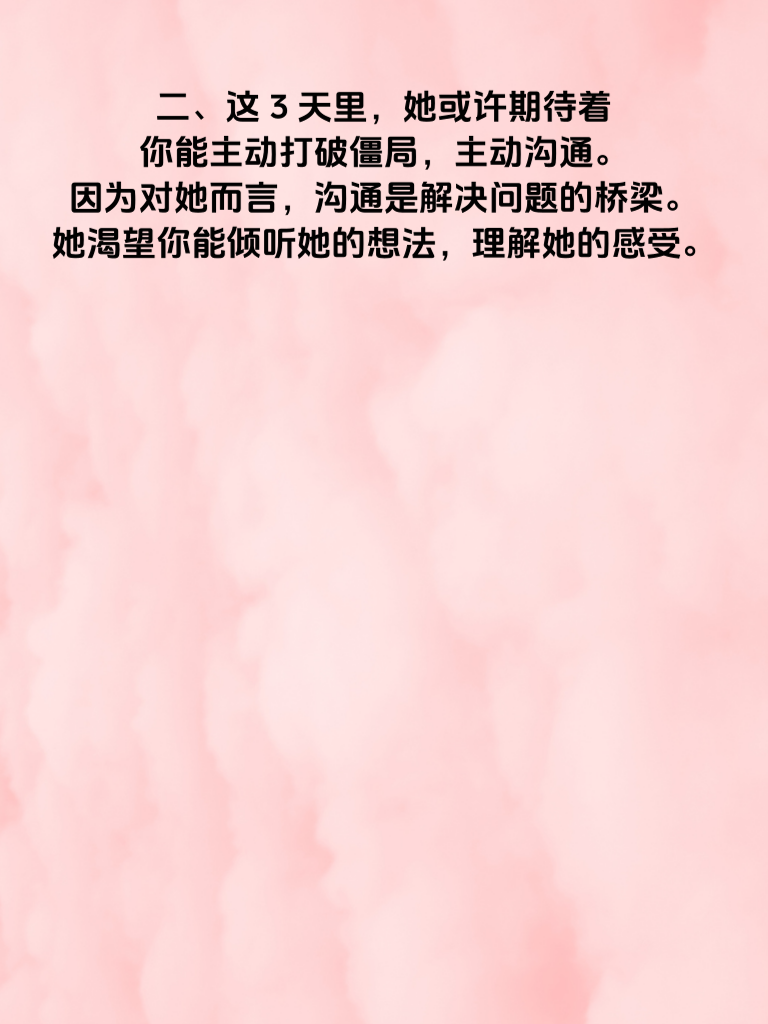 一、婚姻中,冷战是一场危险的游戏。当冷战持续3天,婚姻的危机警铃已然敲响。女人往往心思细腻,冷战时她们内心的痛苦和失望在不断累积。 二、这3天里,她或许期待着你能主动打破僵局,主动沟通。因为对她而言,沟通是解决问题的桥梁。她渴望你能倾听她的想法,理解她的感受。 三、作为男人,要明白冷战只会让矛盾加深。在冷战的第一天,就应该意识到问题的严重性,放下身段去和她交流。真诚地表达自己的歉意,哪怕你觉得自己没有错,也可以先安抚她的情绪。 四、在交流中,不要急于辩解,专注于倾听她的不满。给她充分表达的机会,让她把心里的委屈都说出来。之后再平和地阐述你的观点,寻求双方都能接受的解决方案。 五、记住,婚姻需要用心经营。不要让冷战成为你们感情的杀手,及时化解矛盾,才能让婚姻长久幸福。