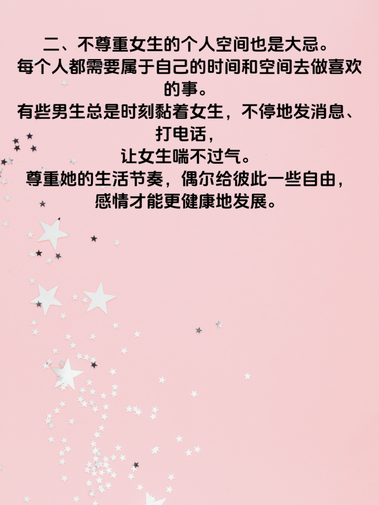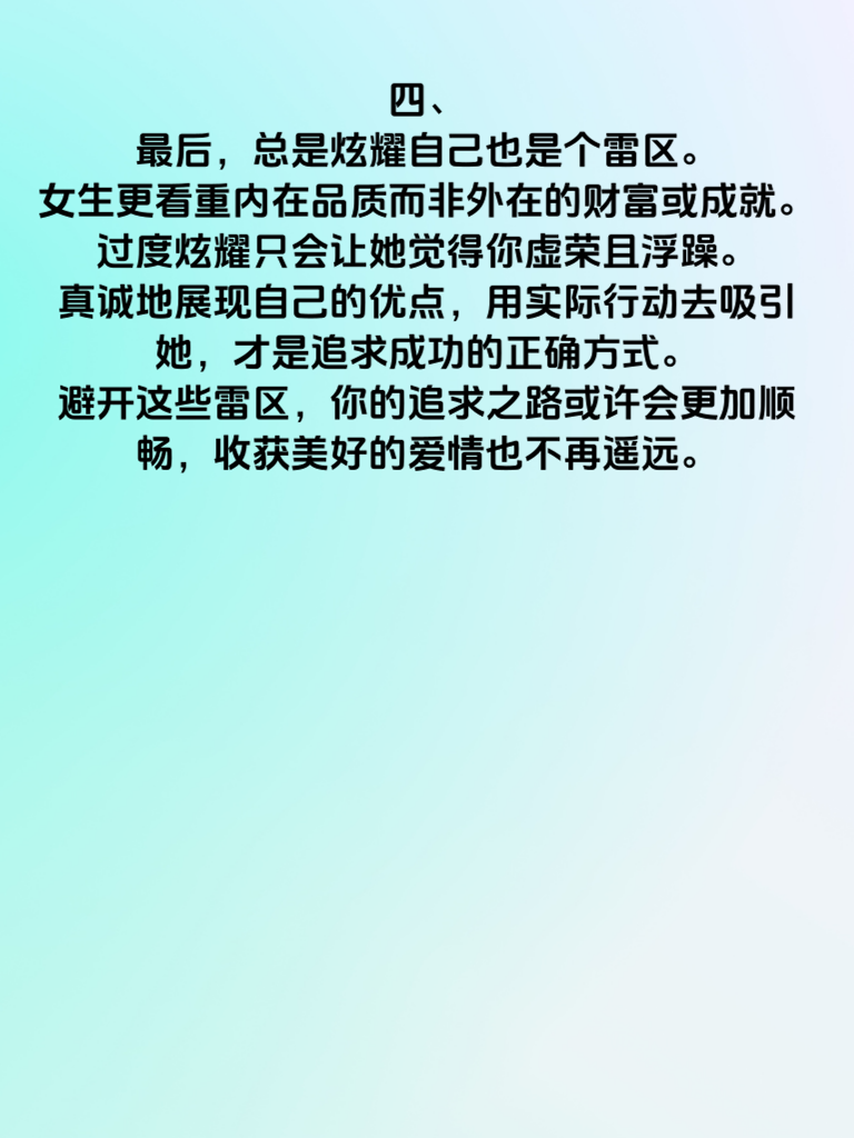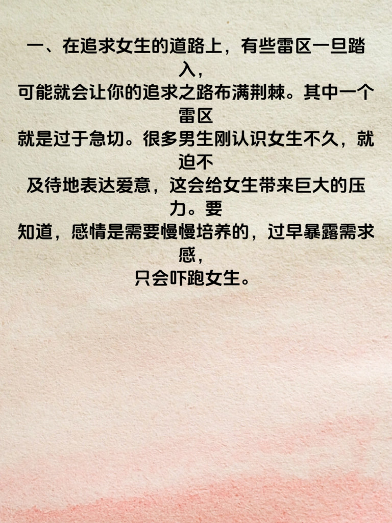 一、在追求女生的道路上,有些雷区一旦踏入,可能就会让你的追求之路布满荆棘。其中一个雷区就是过于急切。很多男生刚认识女生不久,就迫不及待地表达爱意,这会给女生带来巨大的压力。要知道,感情是需要慢慢培养的,过早暴露需求感,只会吓跑女生。 二、不尊重女生的个人空间也是大忌。每个人都需要属于自己的时间和空间去做喜欢的事。有些男生总是时刻黏着女生,不停地发消息、打电话,让女生喘不过气。尊重她的生活节奏,偶尔给彼此一些自由,感情才能更健康地发展。 三、还有,不懂倾听女生的想法也很糟糕。女生在分享自己的事情时,是希望得到理解和回应的。若你总是打断她,或者对她的话题不感兴趣,她会觉得你不在乎她。学会耐心倾听,给予她情感上的支持,会让她更愿意靠近你。 四、最后,总是炫耀自己也是个雷区。女生更看重内在品质而非外在的财富或成就。过度炫耀只会让她觉得你虚荣且浮躁。真诚地展现自己的优点,用实际行动去吸引她,才是追求成功的正确方式。避开这些雷区,你的追求之路或许会更加顺畅,收获美好的爱情也不再遥远。