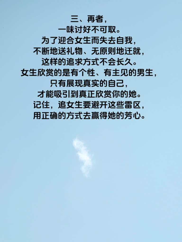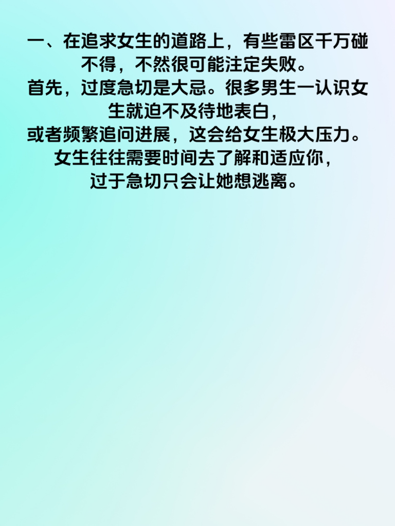 一、在追求女生的道路上,有些雷区千万碰不得,不然很可能注定失败。首先,过度急切是大忌。很多男生一认识女生就迫不及待地表白,或者频繁追问进展,这会给女生极大压力。女生往往需要时间去了解和适应你,过于急切只会让她想逃离。 二、还有,缺乏尊重也不行。每个人都有自己的想法和空间,追女生时若不尊重她的意见、喜好,强行把自己的观念强加给她,只会让她心生反感。比如,未经她同意就安排约会行程,这会让她觉得你不重视她的感受。 三、再者,一味讨好不可取。为了迎合女生而失去自我,不断地送礼物、无原则地迁就,这样的追求方式不会长久。女生欣赏的是有个性、有主见的男生,只有展现真实的自己,才能吸引到真正欣赏你的她。记住,追女生要避开这些雷区,用正确的方式去赢得她的芳心。