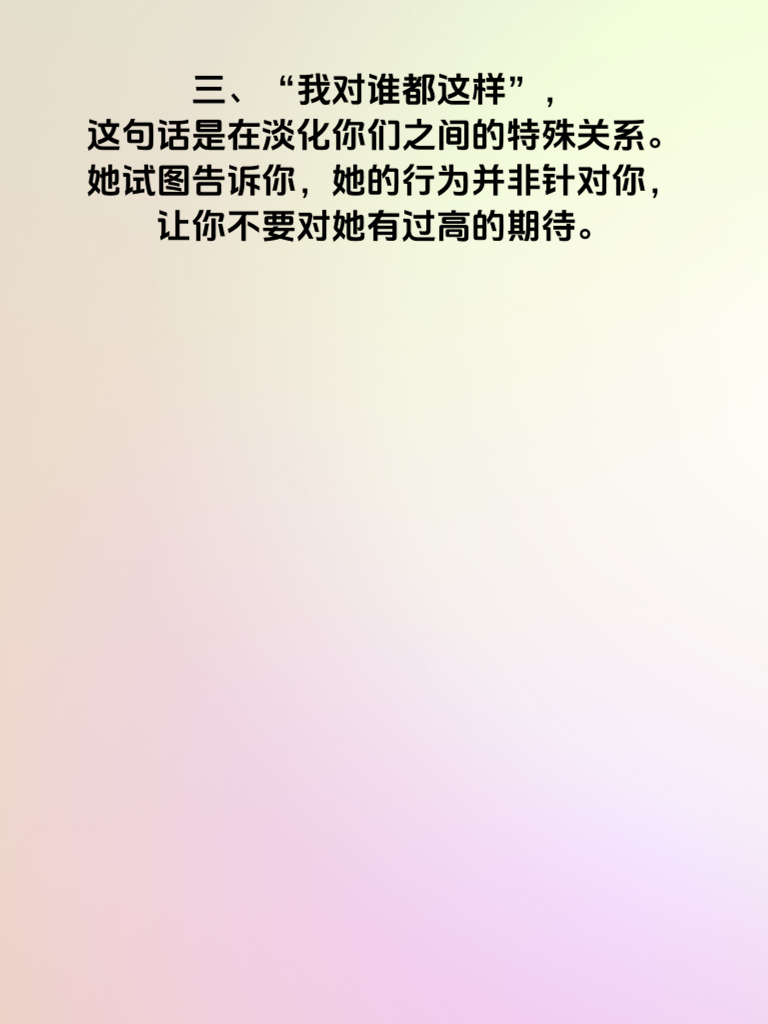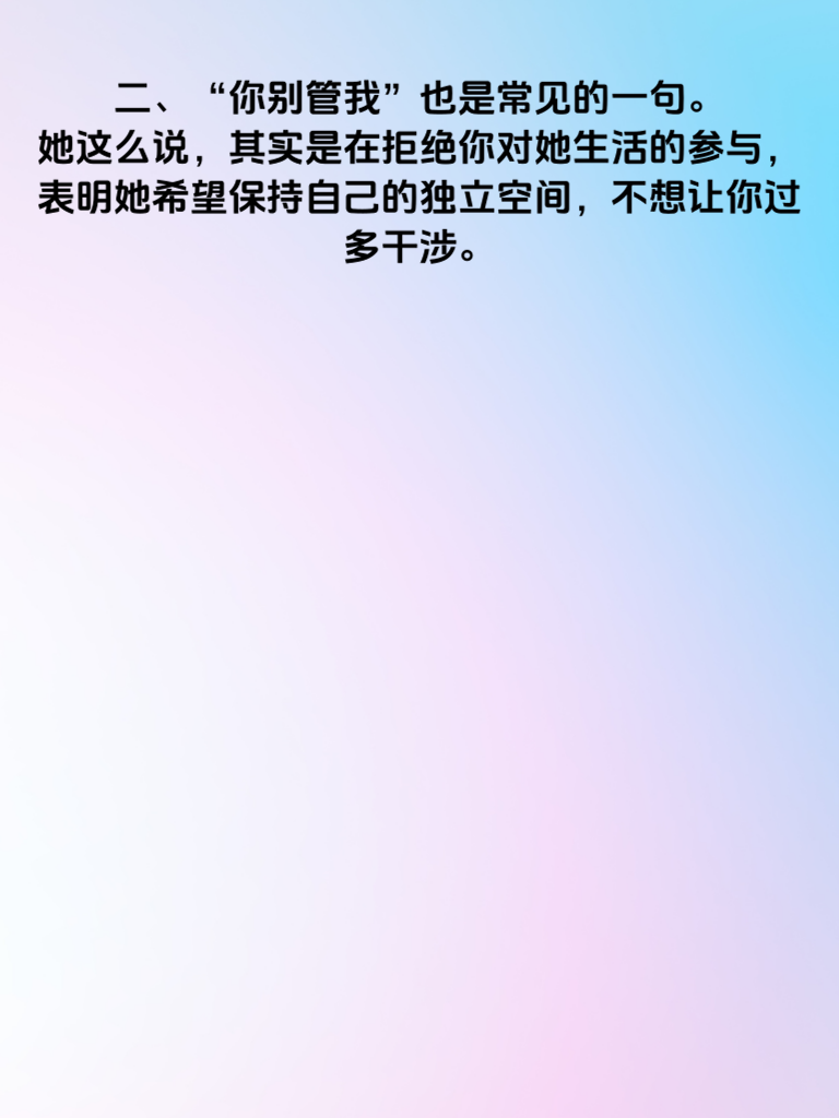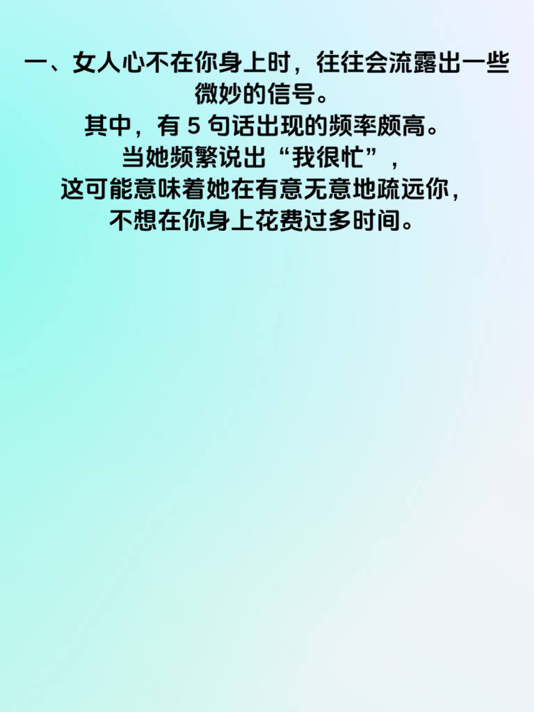 一、女人心不在你身上时,往往会流露出一些微妙的信号。其中,有5句话出现的频率颇高。当她频繁说出“我很忙”,这可能意味着她在有意无意地疏远你,不想在你身上花费过多时间。 二、“你别管我”也是常见的一句。她这么说,其实是在拒绝你对她生活的参与,表明她希望保持自己的独立空间,不想让你过多干涉。 三、“我对谁都这样”,这句话是在淡化你们之间的特殊关系。她试图告诉你,她的行为并非针对你,让你不要对她有过高的期待。 四、“我觉得我们不合适”,这直接表明了她内心的想法,她已经开始审视你们的关系,觉得彼此在某些方面存在差异,难以继续发展。 五、“我现在不想谈恋爱”,这是一种明确的拒绝。她可能还没有做好恋爱的准备,或者心里已经有了其他人选,而你不在她的考虑范围内。男生们要留意这些话语,及时调整自己的追求策略。