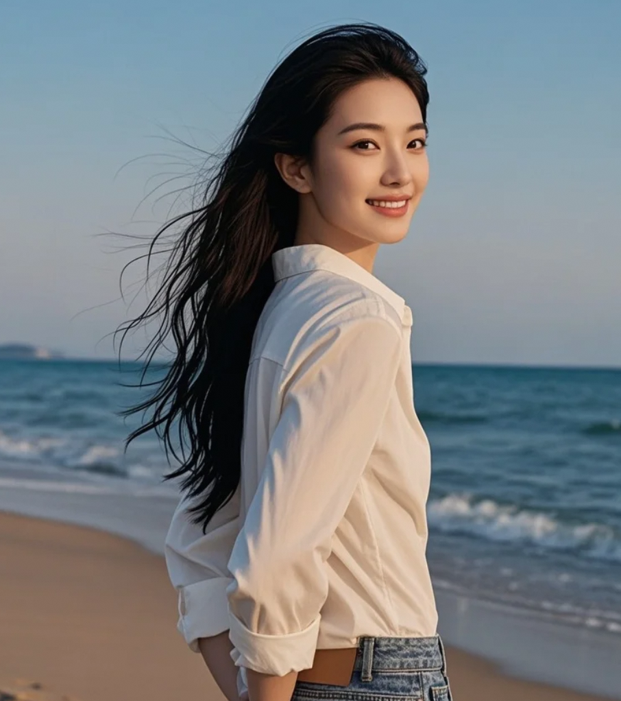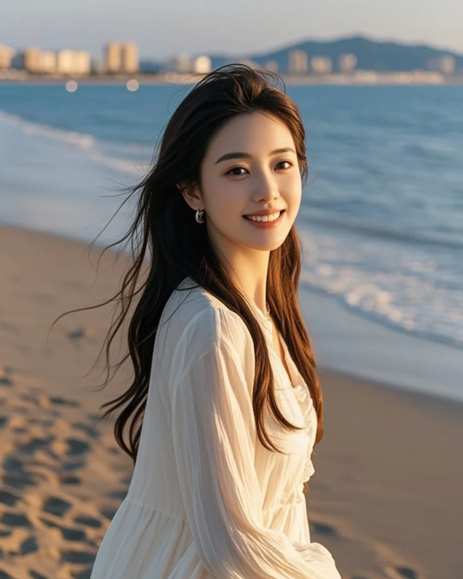 沙滩上长发轻舞,晚风拂面,尽显优雅脱俗气质