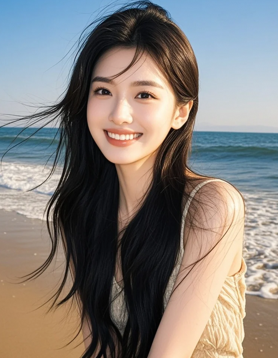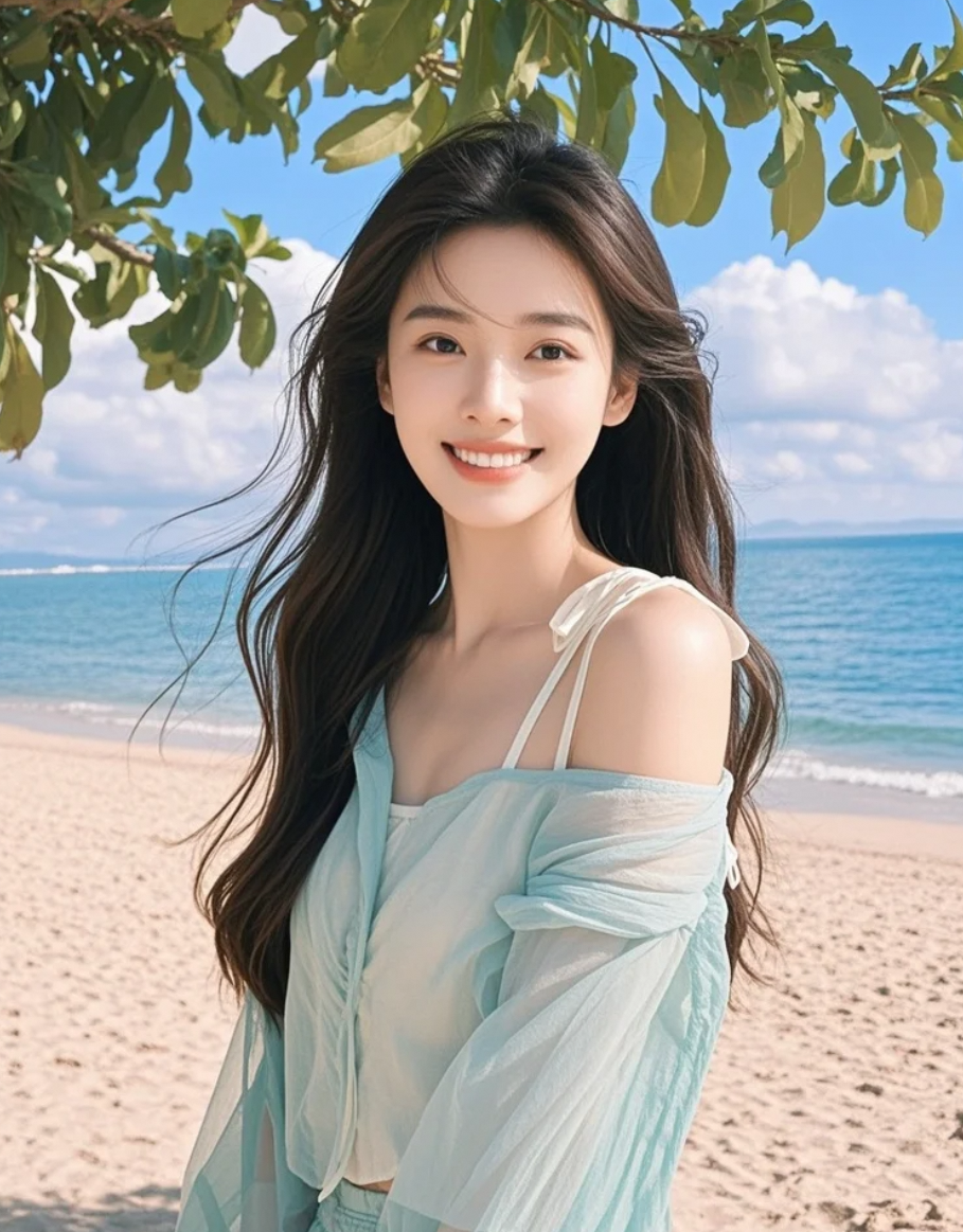 宁静沙滩,长发女孩在阳光下展现动人诗意瞬间