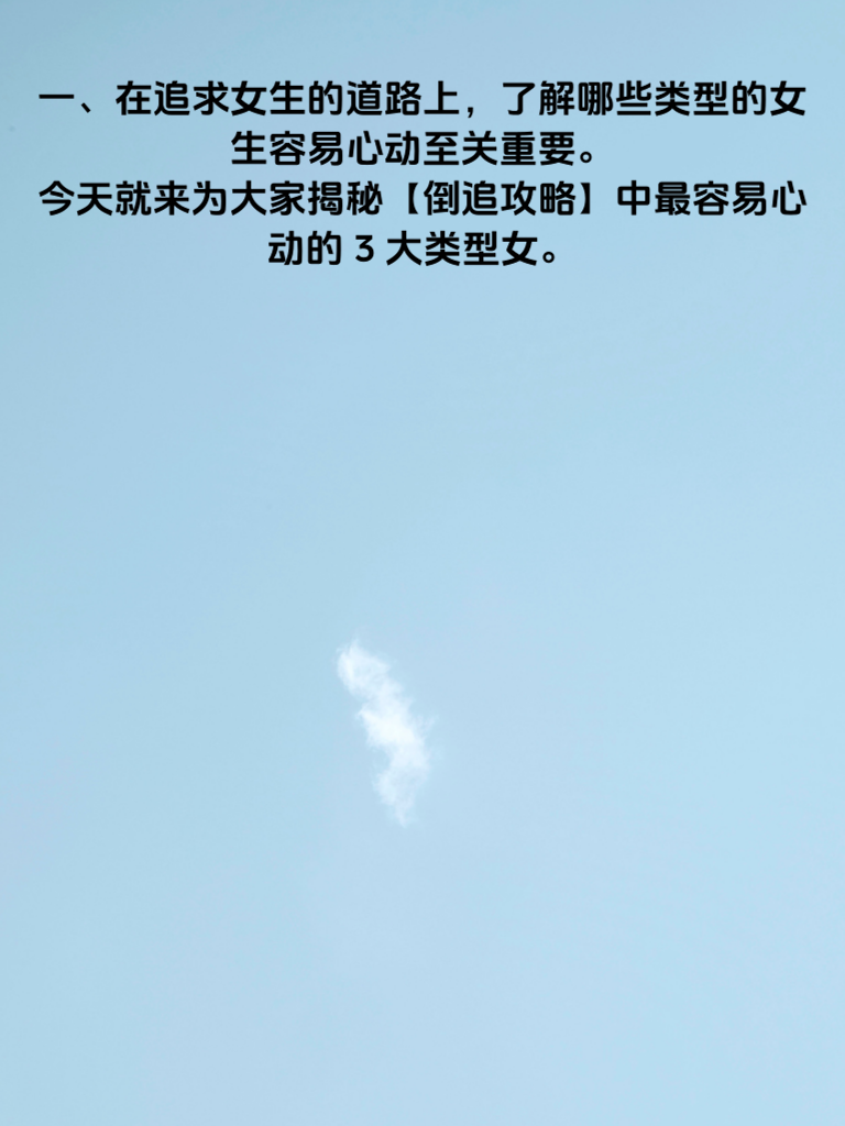 一、在追求女生的道路上,了解哪些类型的女生容易心动至关重要。今天就来为大家揭秘【倒追攻略】中最容易心动的3大类型女。 二、第一种是文艺气质型女生。她们内心细腻,充满诗意。你可以和她一起漫步在宁静的书店,分享彼此喜欢的书籍;或是在月色下,聆听她轻声朗诵优美的诗篇。用你的温柔与才情,叩开她的心门。 三、第二种是独立自强型女生。她们有自己的追求和梦想,欣赏有上进心的人。当她在事业上拼搏时,给予支持与鼓励;在生活中遇到困难,帮她出谋划策。展现你的靠谱与担当,让她对你倾心。 四、第三种是乐观开朗型女生。她们总是带着灿烂的笑容,能感染身边的人。多和她一起参加有趣的活动,制造欢乐的氛围。用你的幽默风趣,成为她生活中的开心果,让她在快乐中渐渐对你心动。掌握这些攻略,相信你能收获美好的爱情。