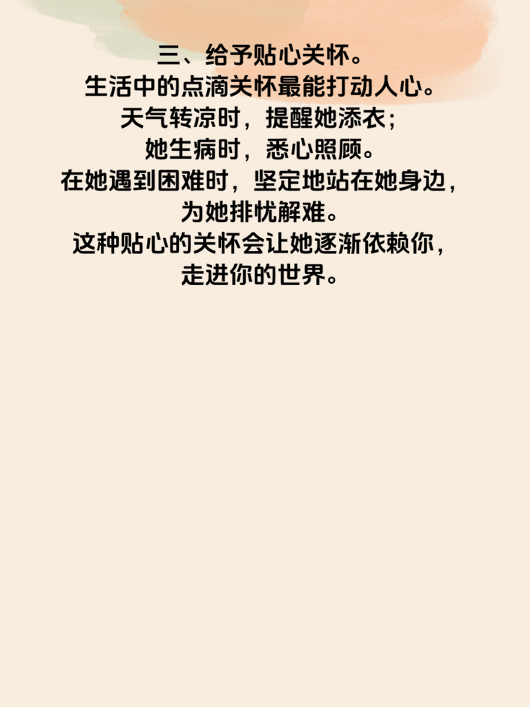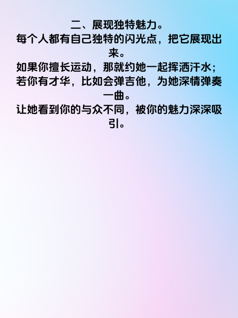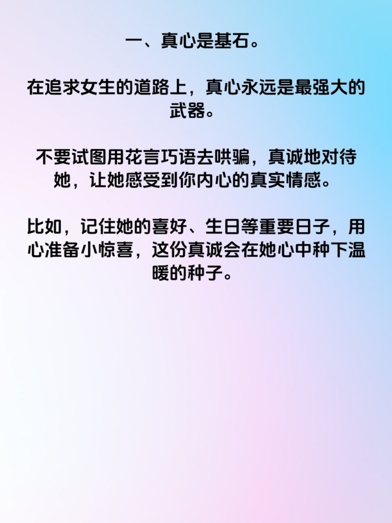 一、真心是基石。在追求女生的道路上,真心永远是最强大的武器。不要试图用花言巧语去哄骗,真诚地对待她,让她感受到你内心的真实情感。比如,记住她的喜好、生日等重要日子,用心准备小惊喜,这份真诚会在她心中种下温暖的种子。 二、展现独特魅力。每个人都有自己独特的闪光点,把它展现出来。如果你擅长运动,那就约她一起挥洒汗水;若你有才华,比如会弹吉他,为她深情弹奏一曲。让她看到你的与众不同,被你的魅力深深吸引。 三、给予贴心关怀。生活中的点滴关怀最能打动人心。天气转凉时,提醒她添衣;她生病时,悉心照顾。在她遇到困难时,坚定地站在她身边,为她排忧解难。这种贴心的关怀会让她逐渐依赖你,走进你的世界。