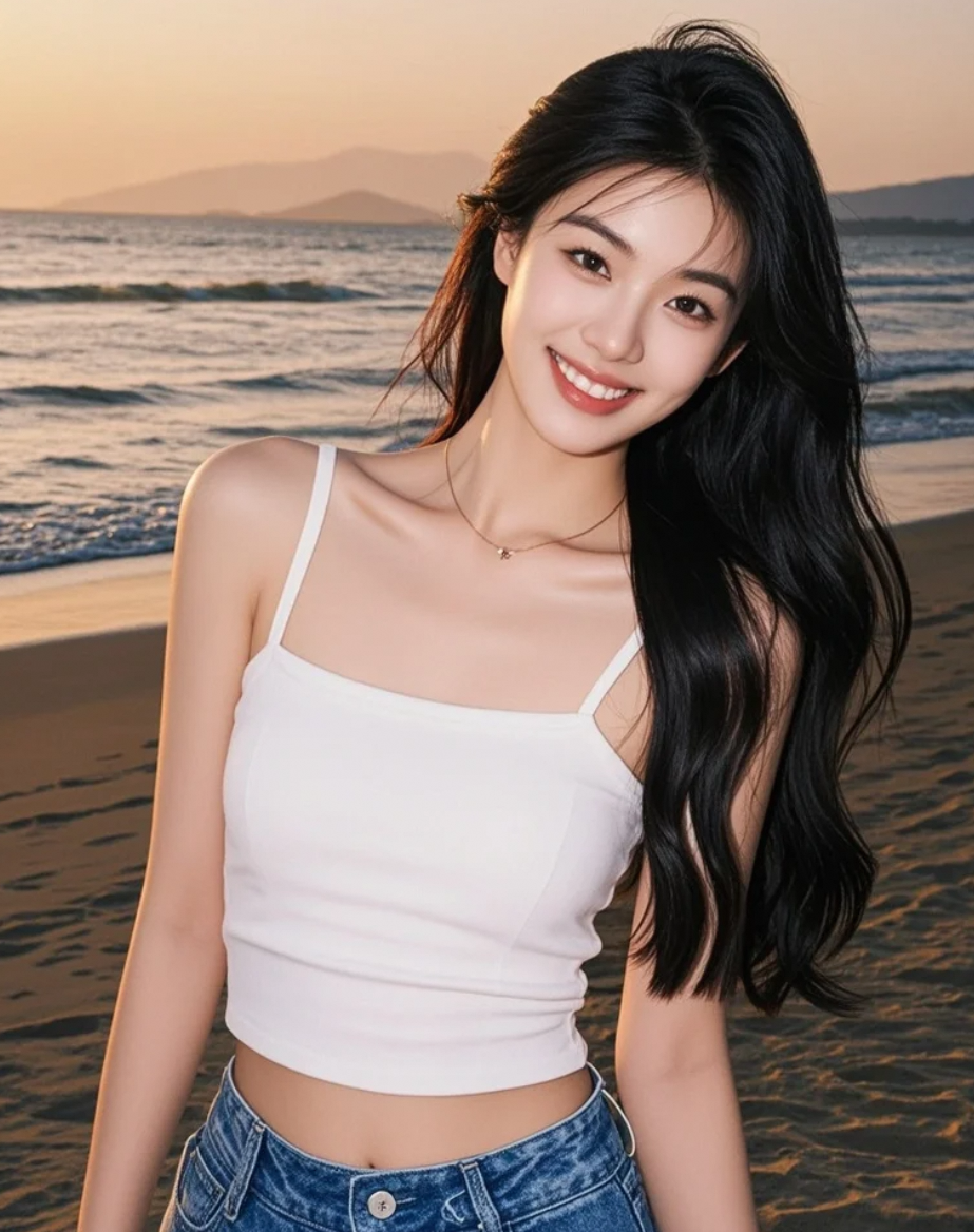 沙滩上的她,长发随晚风轻扬,笑容如诗般宁静