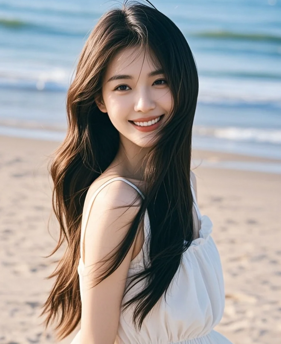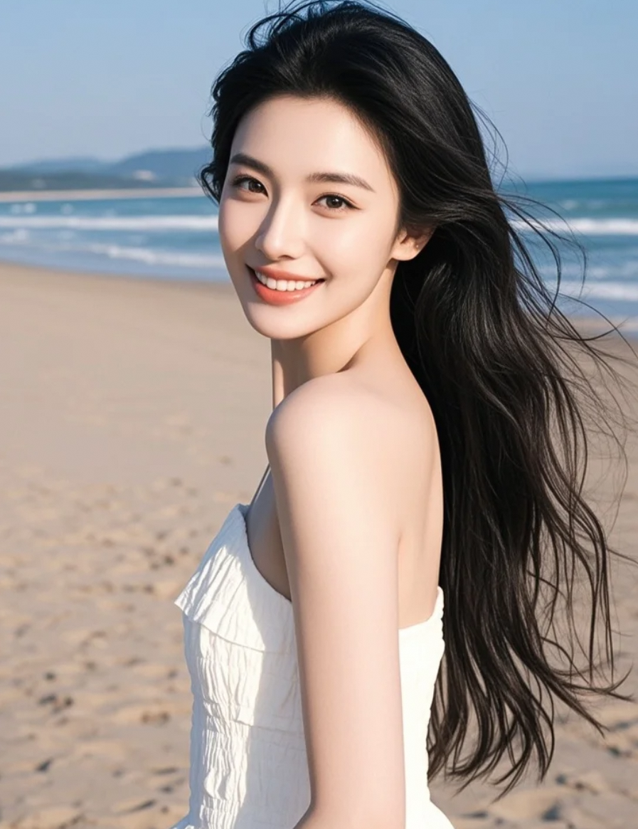长发女孩在阳光沙滩,以优雅姿态演绎浪漫情怀