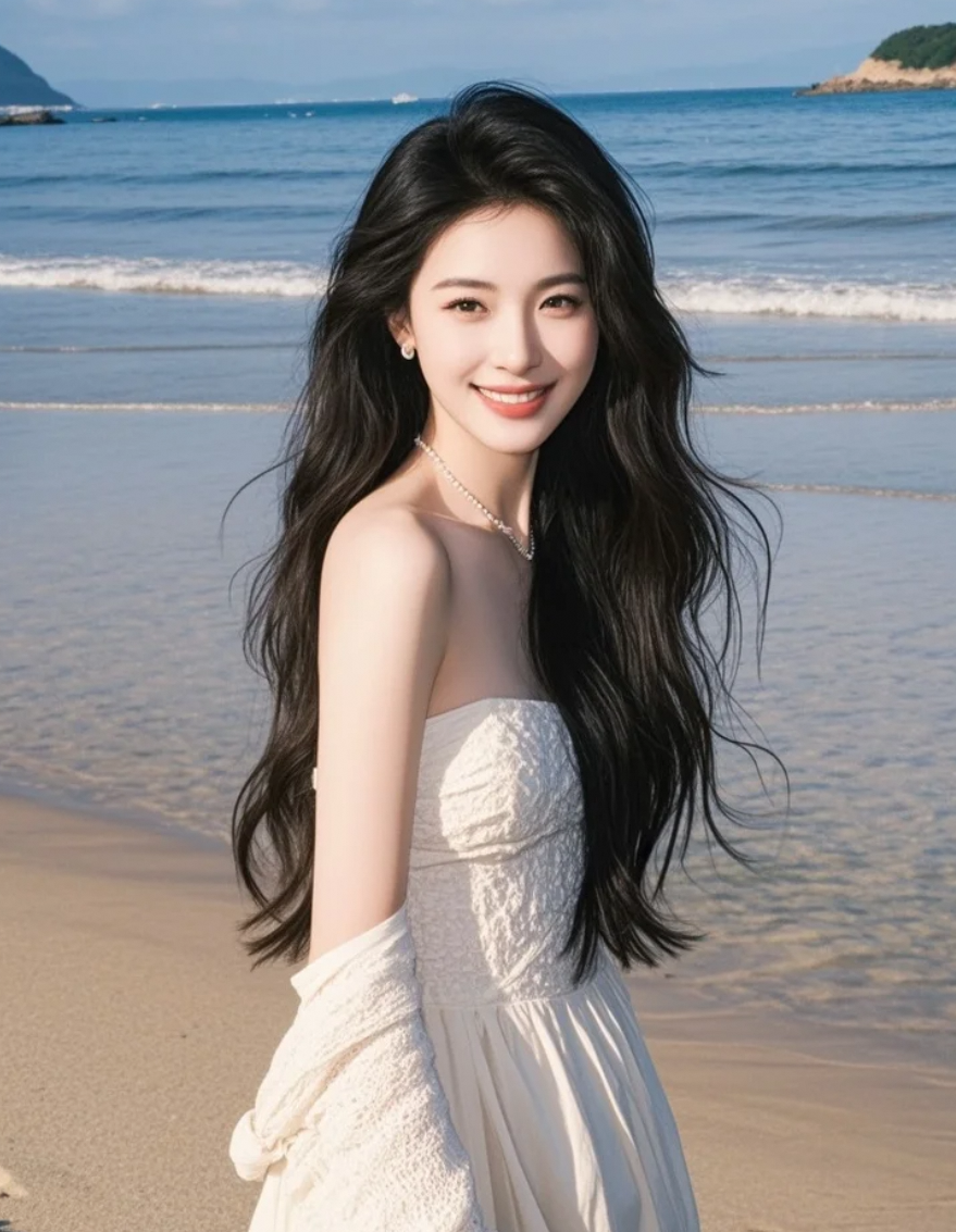 晚风中的沙滩,长发女孩的笑容洋溢着青春气息