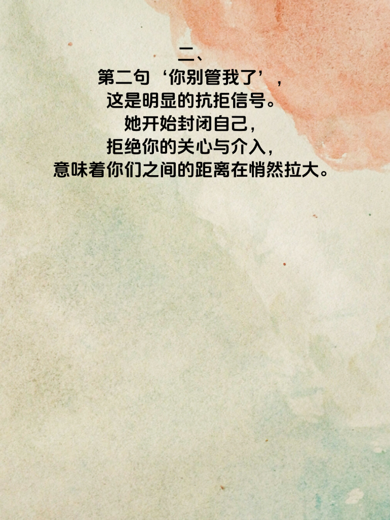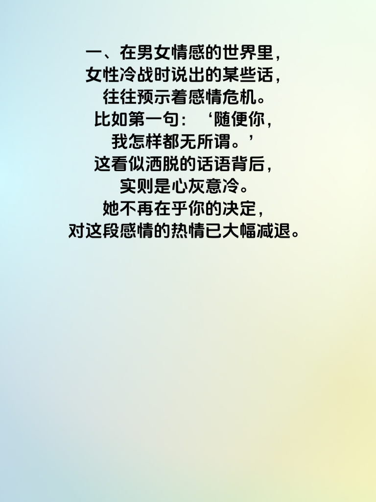 一、在男女情感的世界里,女性冷战时说出的某些话,往往预示着感情危机。比如第一句:‘随便你,我怎样都无所谓。’这看似洒脱的话语背后,实则是心灰意冷。她不再在乎你的决定,对这段感情的热情已大幅减退。 二、第二句‘你别管我了’,这是明显的抗拒信号。她开始封闭自己,拒绝你的关心与介入,意味着你们之间的距离在悄然拉大。 三、‘我不想再谈了’,直接表明她对这段感情交流的厌烦。冷战至此,她对沟通修复关系失去信心,感情进入危险地带。 四、‘你觉得这样好就行’,这种敷衍的回应,是她对感情不再用心经营的体现。她不再积极参与感情走向,危机四伏。 五、‘我和你没什么可说的了’,宣告着情感交流的枯竭。当她说出这话,感情已岌岌可危,若不及时化解冷战,挽回感情,很可能就此走向终结。