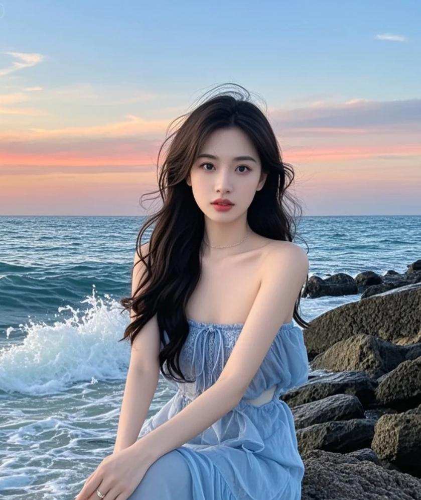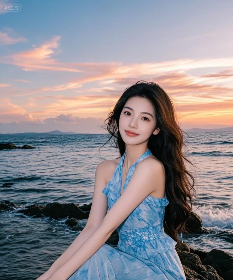 赤足踏过被晚霞亲吻的礁石,每一步都印着光的吻痕。