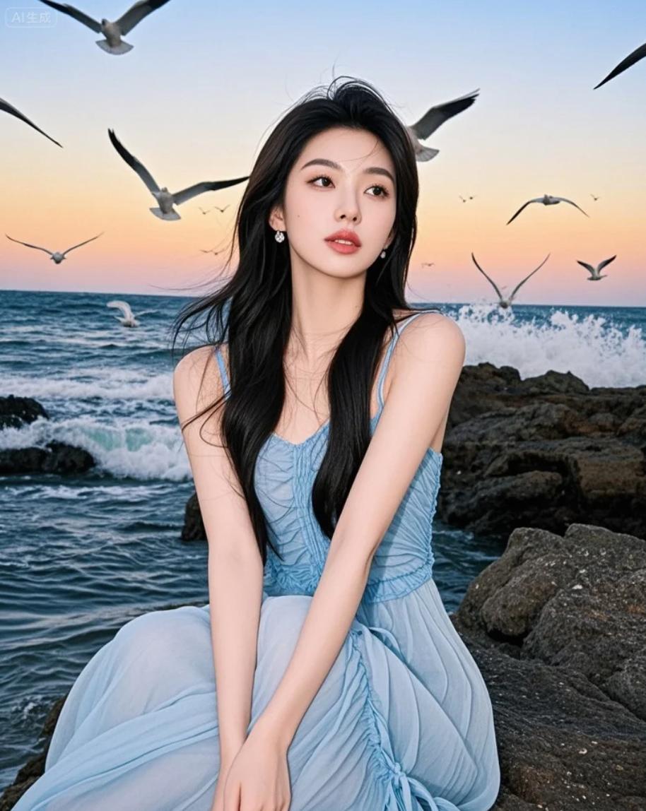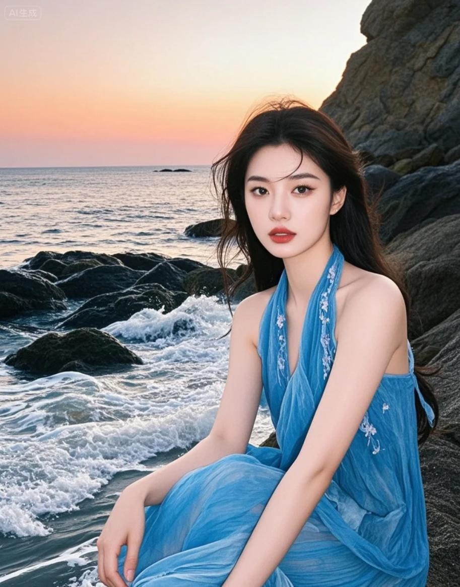 礁石守望大海,她守望晚霞,两个静默的凝望者。