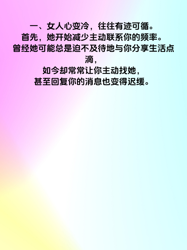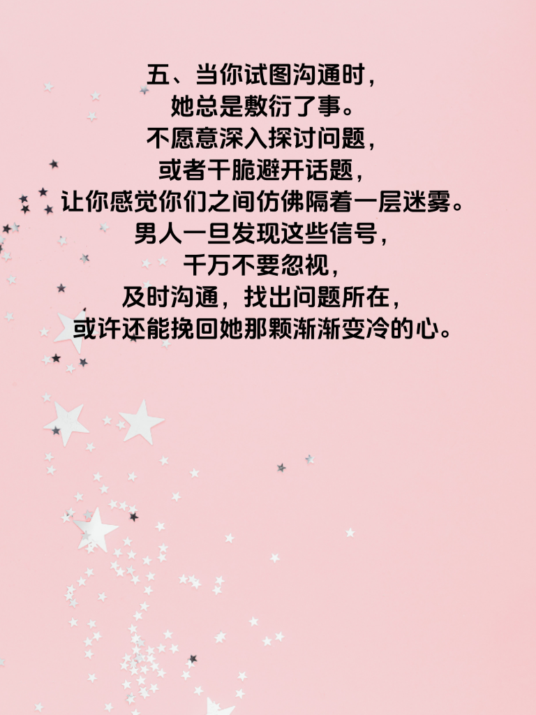 一、女人心变冷,往往有迹可循。首先,她开始减少主动联系你的频率。曾经她可能总是迫不及待地与你分享生活点滴,如今却常常让你主动找她,甚至回复你的消息也变得迟缓。 二、在相处时,她的态度变得冷淡。不再像以前那样热情回应你的玩笑或关心,笑容也越来越少,仿佛对一切都提不起兴趣。 三、对于你们共同的计划,她不再积极参与。以前总是满心期待地和你一起规划未来,现在却总是找借口推脱,不再关心那些曾经让她兴奋的事情。 四、她开始刻意保持距离。身体上不再像以前那样亲密,会避免与你有过多的肢体接触,眼神交流也明显减少。 五、当你试图沟通时,她总是敷衍了事。不愿意深入探讨问题,或者干脆避开话题,让你感觉你们之间仿佛隔着一层迷雾。男人一旦发现这些信号,千万不要忽视,及时沟通,找出问题所在,或许还能挽回她那颗渐渐变冷的心。