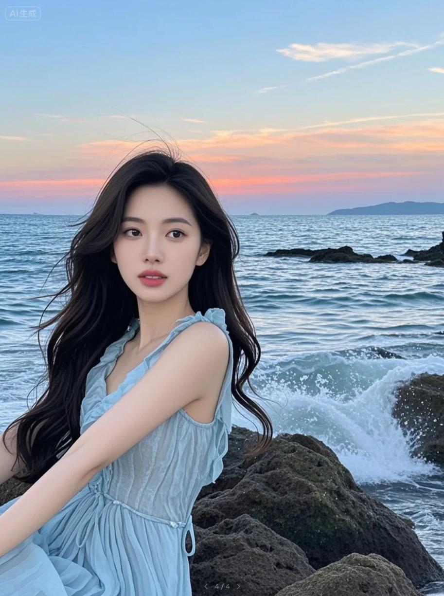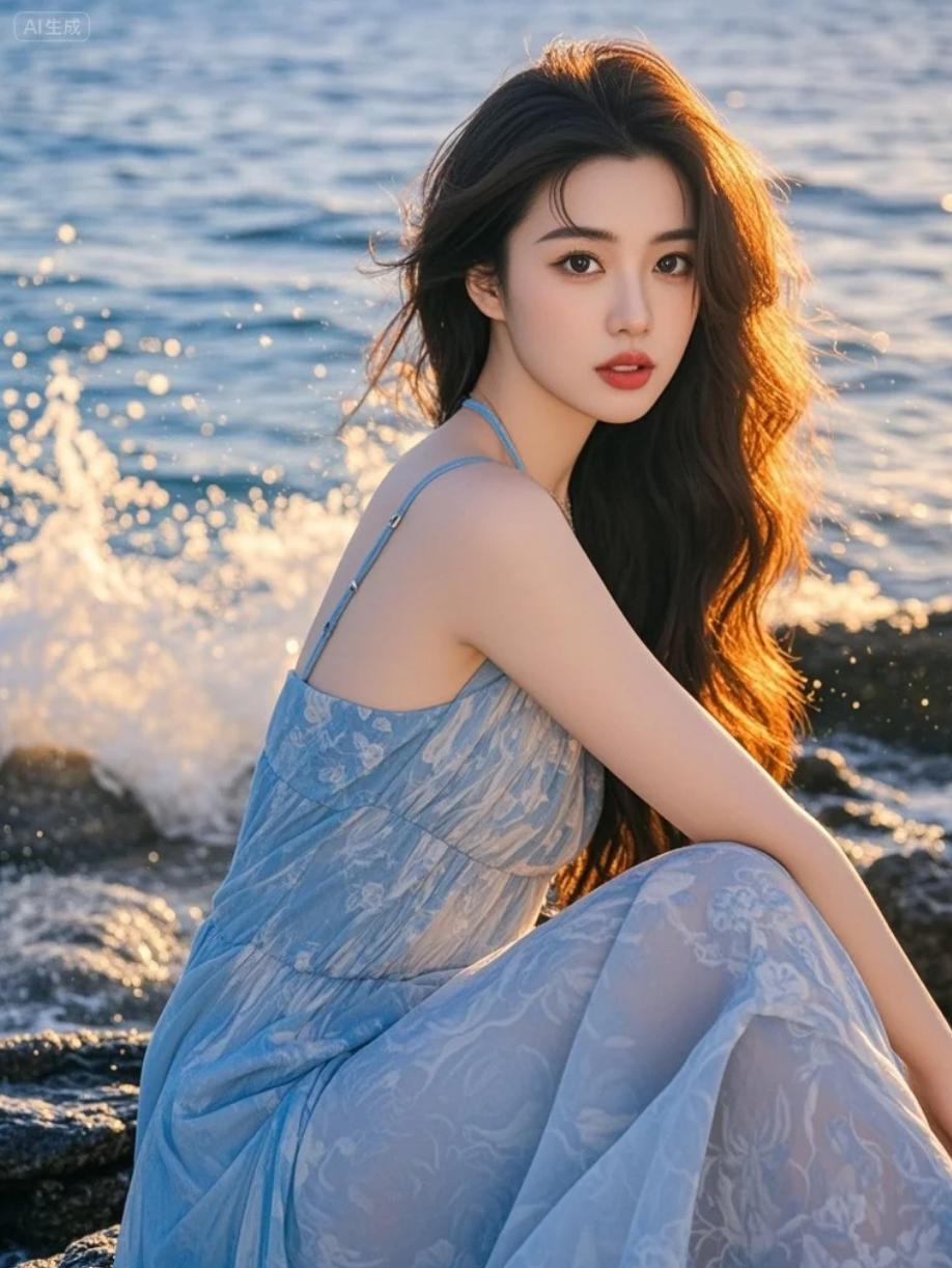 裙裾飞扬,她转身回眸,晚霞与礁石共绘绝美瞬间。