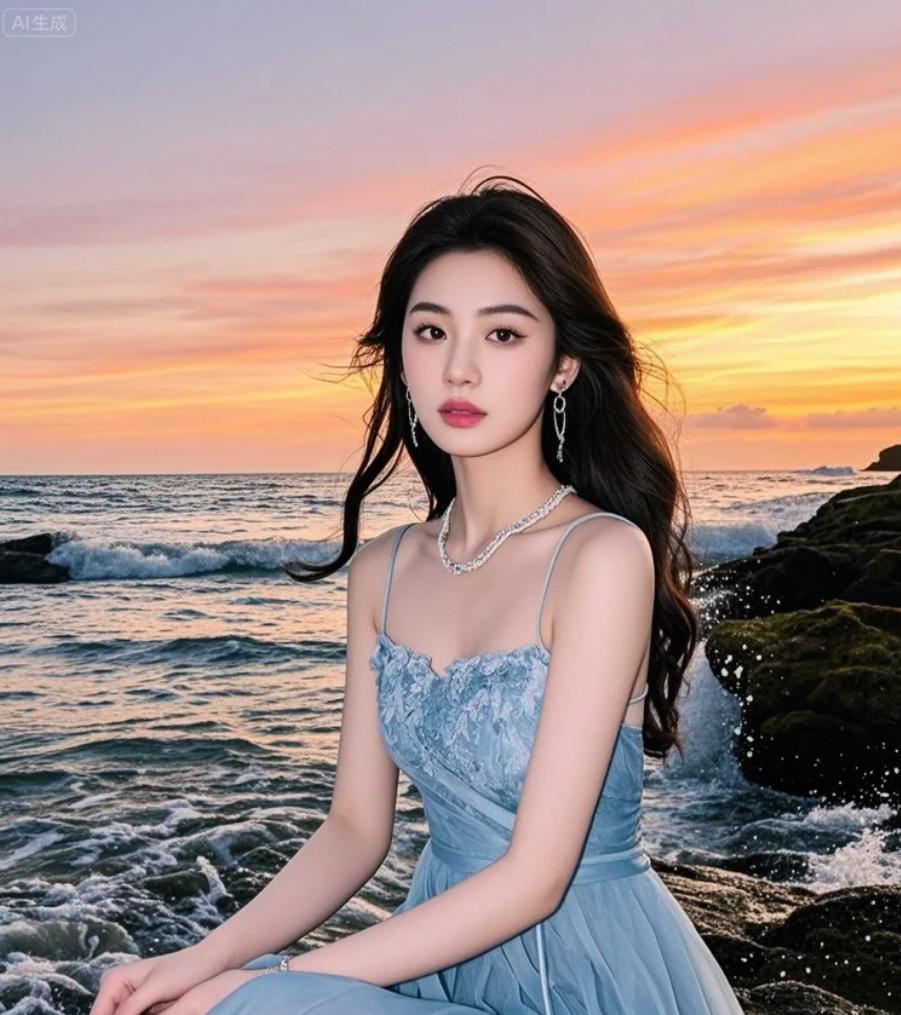 她小心攀爬,晚霞为她的身影镀上金边,礁石是阶梯。