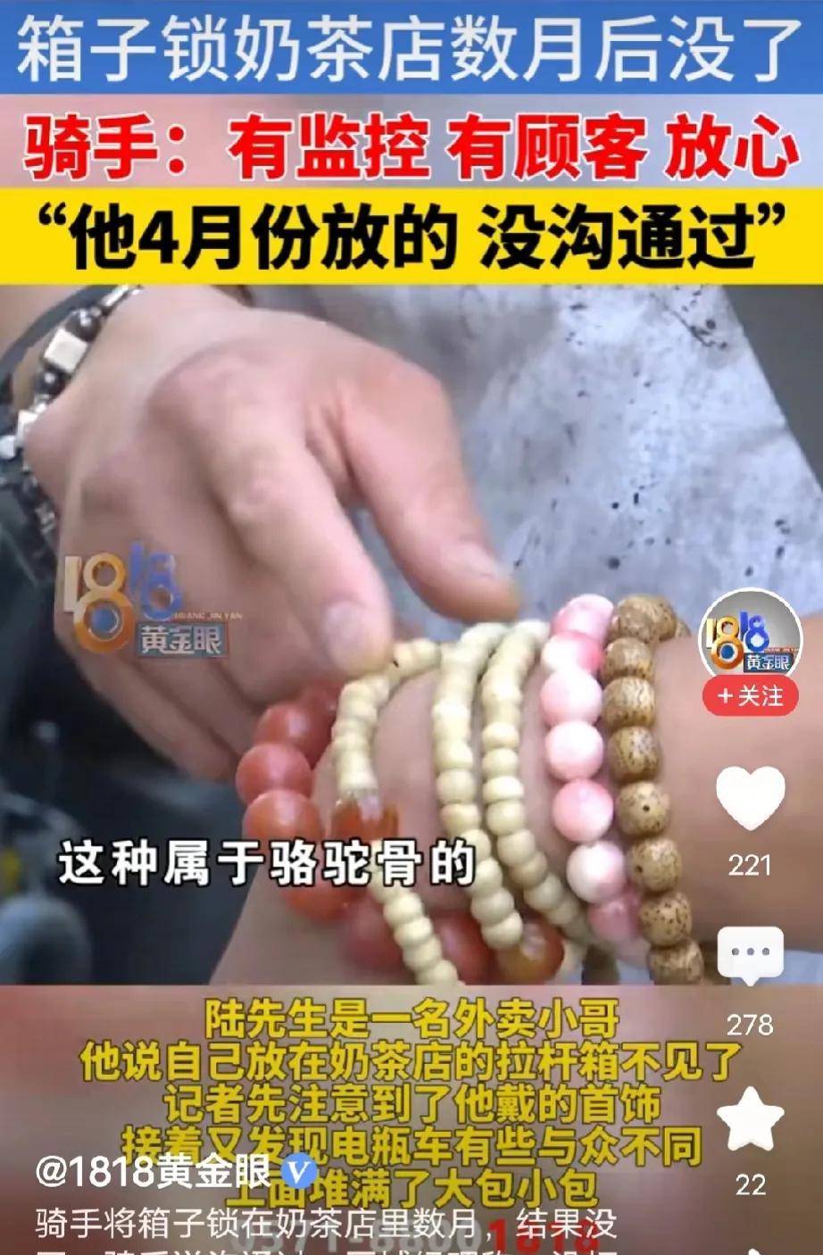 2025年8月浙江杭州,男子把行李箱锁在奶茶店桌角,3个月不闻不问,店家报警,警察说再等等,如果实在没人认领自行处理。等了2个月,店家扔掉了行李箱,谁料,2天后,男子找上门,说行李箱里有贵重物品,价值3万元,要求店家赔偿。网友:放了仨月不管,扔了就跳出来要赔偿,算盘打得可真精。 “我箱子里有骆驼骨工艺品、克罗心银饰,还有德国品牌配饰,加起来值3万!你们说扔就扔,必须赔!”陆先生站在奶茶店柜台前,语气激动地拍着桌子。 而店家负责人却皱着眉反驳:“您说七月中旬放的箱子,可监控显示四月份它就一直在这了,您从没留过联系方式,我们等了五个月才处理的!” 这场争执发生在箱子被扔掉的第二天,却让过去几个月的“无主行李箱”谜团,一下子摆到了公众面前。 陆先生是安徽人,在杭州送外卖三年,他说自己因为觉得出租屋不安全,习惯把贵重物品带在身边。 今年七月中旬,他看中这家奶茶店有24小时监控、有人值守,就把锁好的行李箱绑在桌角,还特意跟店员打了招呼——“当时店员‘嗯’了一声,我以为没问题,就放心走了”。 直到八月上旬,他想起要拿箱子,才发现箱子没了,找店家问才知道被扔了。在他看来,自己提前打过招呼,店家没经他同意就丢东西,必须赔偿箱内3万元物品。 可奶茶店的说法却完全不同。负责人拿出报警记录和监控截图:“这箱子四月份就出现在店里了,没人知道是谁放的,也没人来问过。 它占着桌子,客人都没法坐,我们五月份就报警了,警察说‘再等等,没人认领就自行处理’,我们又等了两个多月,到八月八号才扔的。” 更关键的是,警方调取的四月到七月的监控显示,陆先生放置箱子时,只是把箱子绑在桌角,没有跟任何店员交流,店员当时在忙订单,确实没抬头回应。 这与陆先生“打过招呼”的说法,形成了尖锐对立。 双方各执一词,争执不下,陆先生先报了警,可警方因为“事实不清、证据不足”没立案,他只好找媒体求助。 这时候,法律层面的争议也浮出水面。有律师分析,根据《民法典》,如果行李箱是“遗失物”,奶茶店作为拾获方,应该交给公安机关,而不是自行丢弃。 哪怕警方说过“自行处理”,这个建议也不能替代法定程序,公安机关收到遗失物后,要发招领公告,满一年没人认领才能归国家,奶茶店直接扔掉,若真造成陆先生损失,可能要承担民事赔偿。 但反过来,陆先生也有举证义务。他说箱内物品值3万,却拿不出购买凭证,也没法证明自己七月放的箱子,就是店家四月发现的那只。 律师也提到,如果陆先生没法证实箱内有贵重物品,甚至被查出虚构事实,可能涉嫌敲诈勒索。不过,目前也不能排除他有其他证据(比如朋友见证、物品照片),所以还不能下定论。 事件被曝光后,网友的评论几乎一边倒。有人说:“价值3万的东西,放奶茶店三个月不管?换谁都不信,明显是想碰瓷。” 还有人吐槽:“店家等了五个月,报警又等了俩月,仁至义尽了,现在跳出来要赔偿,算盘打得全国都听见了。” 也有少数人觉得“法律上店家确实有问题,不该直接扔”,但更多人关注的是陆先生行为的合理性——“真要是贵重物品,谁会放外面几个月不闻不问?” 现在,陆先生还在找证据证明箱内物品,奶茶店也表示“随时欢迎警方和媒体查监控”。这场纠纷的关键,其实藏在两个没解开的疑问里:一是行李箱到底是四月还是七月放的? 二是箱内真的有3万元贵重物品吗?如果监控能厘清时间线,陆先生能拿出物品证据,法律才能给出明确判定;可要是这些疑问一直解不开,这场“行李箱纠纷”,恐怕只会在争议里继续发酵。