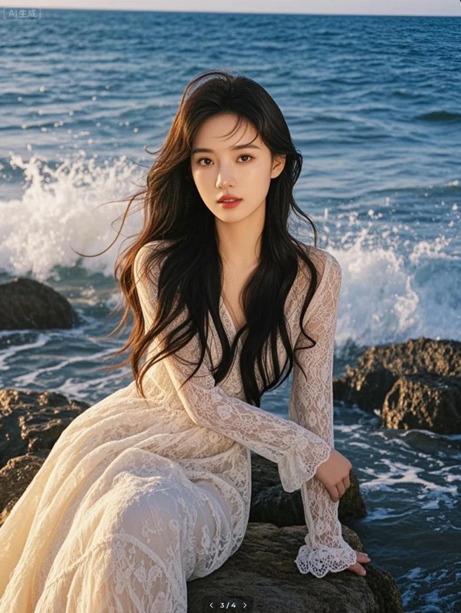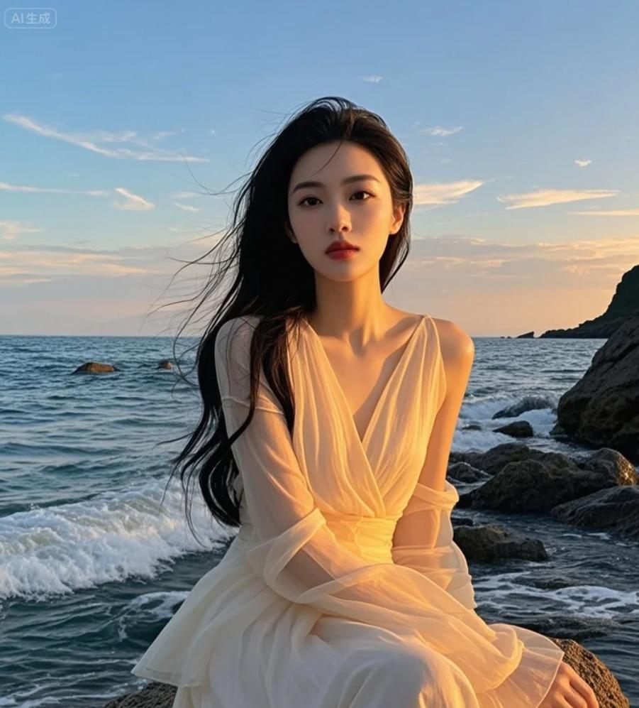 晚霞映红礁石的水洼,她蹲下,凝视水中自己的倒影。