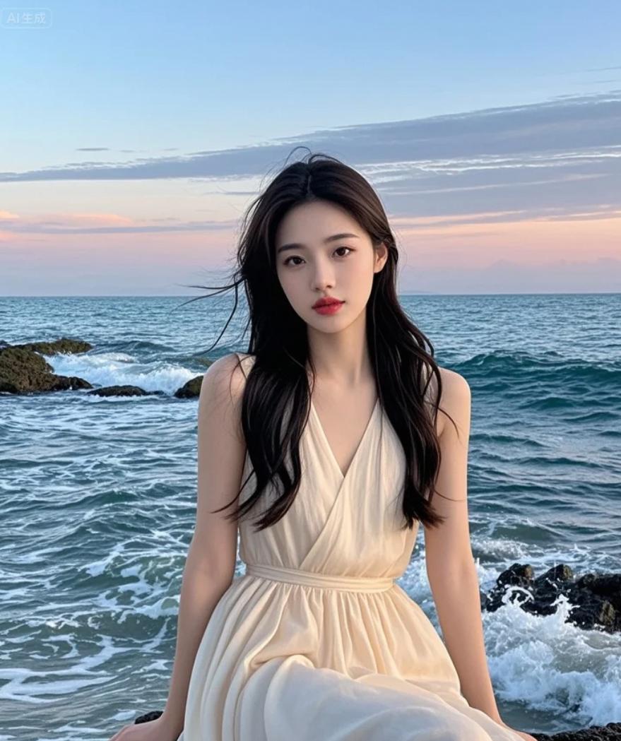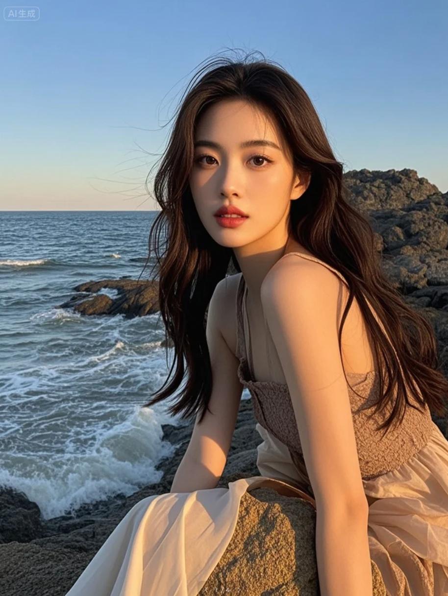她沿着被晚霞照亮的礁石小径,走向海天相接处。