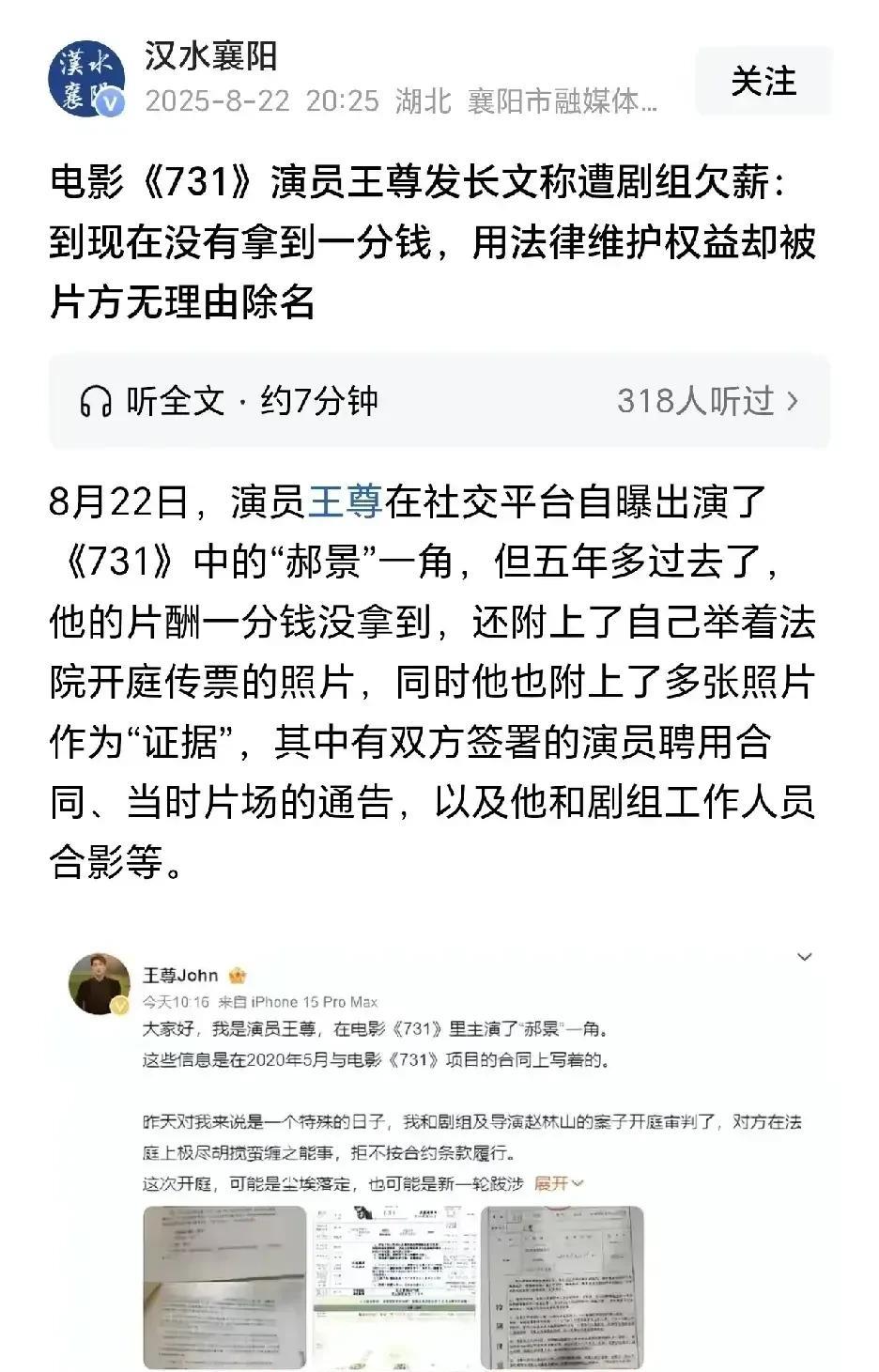 《731》又出幺蛾子了!主演郝景一角的王尊,举报剧组欠薪,还被片方无理由除名! 据说欠薪已经欠了五年多,早不说,晚不说,为什么就在这个节骨眼上,整个舆情出来呢? 再说了,争议已经进入了诉讼程序,还在庭审之中,结果也还没出来,需要迫不及待大张旗鼓的制造舆论来维权吗? 电影还没上映,整出各种舆论,到时候票房扑街,到底谁会开怀大笑? 建议演员王尊,看清形势,顾全大局,别被有的人带沟里去了。 #你支持电影《731》全球上映吗# #731剧组# #定档731电影#