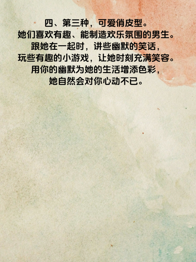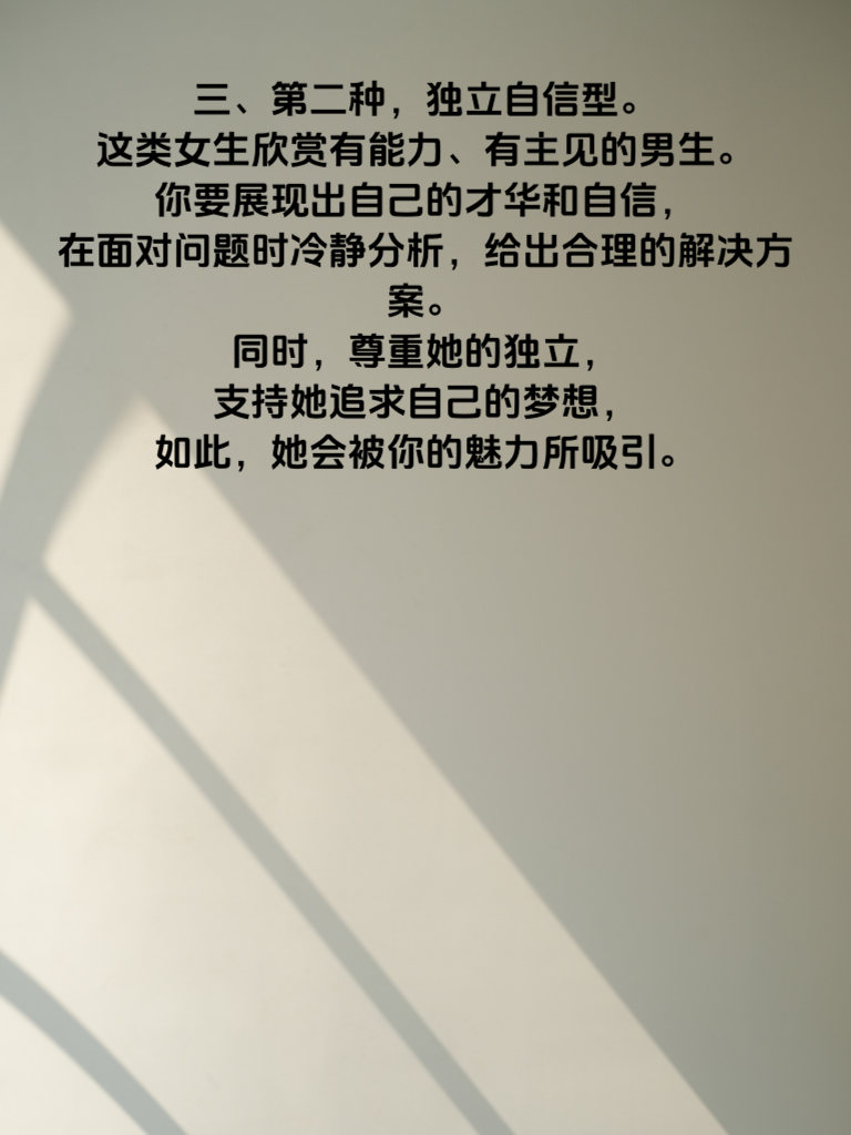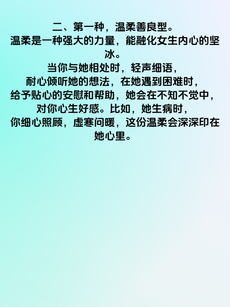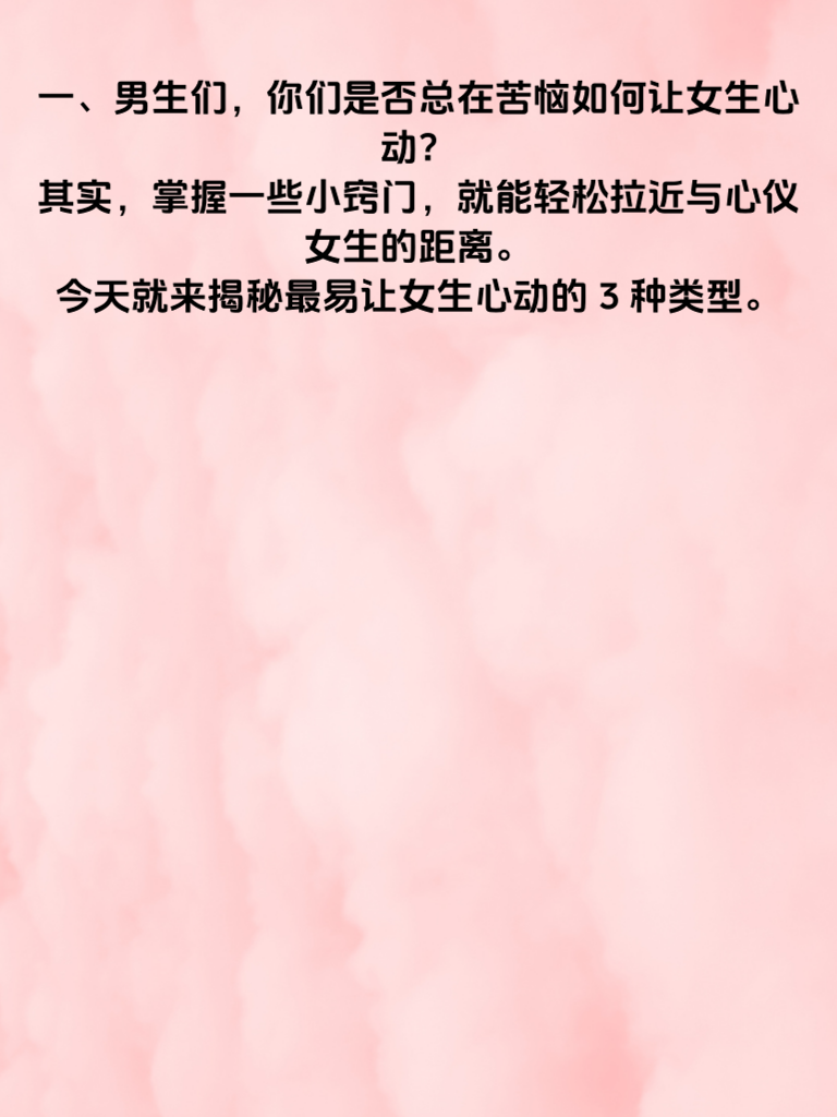 一、男生们,你们是否总在苦恼如何让女生心动?其实,掌握一些小窍门,就能轻松拉近与心仪女生的距离。今天就来揭秘最易让女生心动的3种类型。 二、第一种,温柔善良型。温柔是一种强大的力量,能融化女生内心的坚冰。当你与她相处时,轻声细语,耐心倾听她的想法,在她遇到困难时给予贴心的安慰和帮助,她会在不知不觉中对你心生好感。比如,她生病时,你细心照顾,虚寒问暖,这份温柔会深深印在她心里。 三、第二种,独立自信型。这类女生欣赏有能力、有主见的男生。你要展现出自己的才华和自信,在面对问题时冷静分析,给出合理的解决方案。同时,尊重她的独立,支持她追求自己的梦想,如此,她会被你的魅力所吸引。 四、第三种,可爱俏皮型。她们喜欢有趣、能制造欢乐氛围的男生。跟她在一起时,讲些幽默的笑话,玩些有趣的小游戏,让她时刻充满笑容。用你的幽默为她的生活增添色彩,她自然会对你心动不已。 五、记住,了解女生心理,展现自身优点,才能在追求之路上事半功倍。愿每个男生都能找到让心仪女生心动的秘诀,收获美好的爱情。
