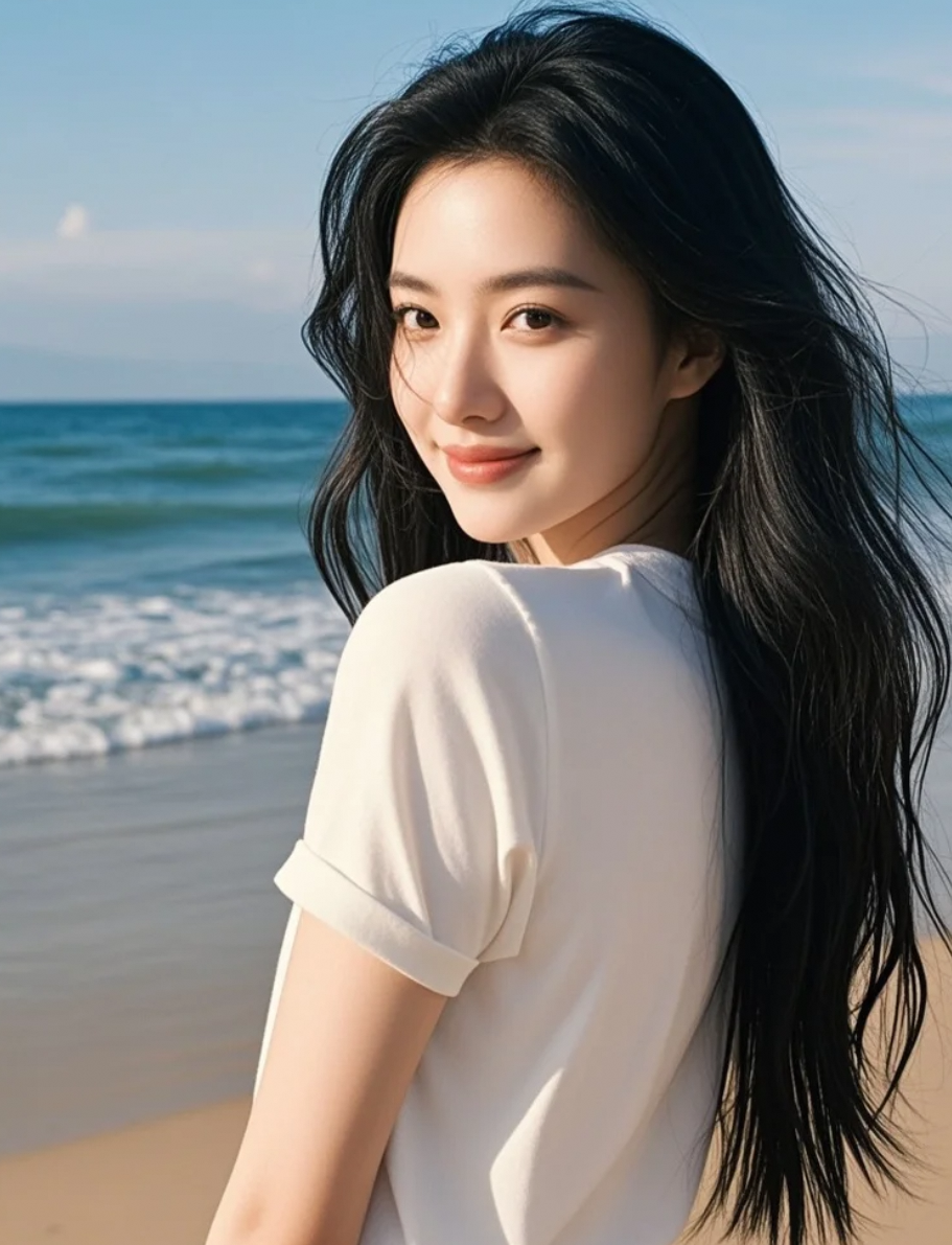 阳光洒落沙滩,她长发飘飘,T恤映衬出温柔诗意