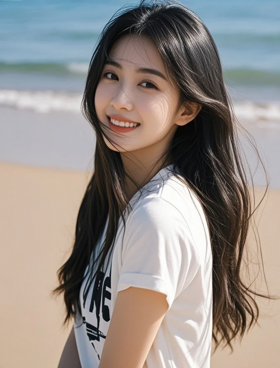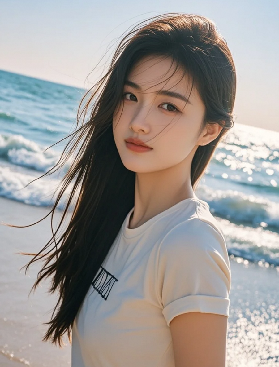 柔和光影里,她伫立海边,长发与晚风交织成画