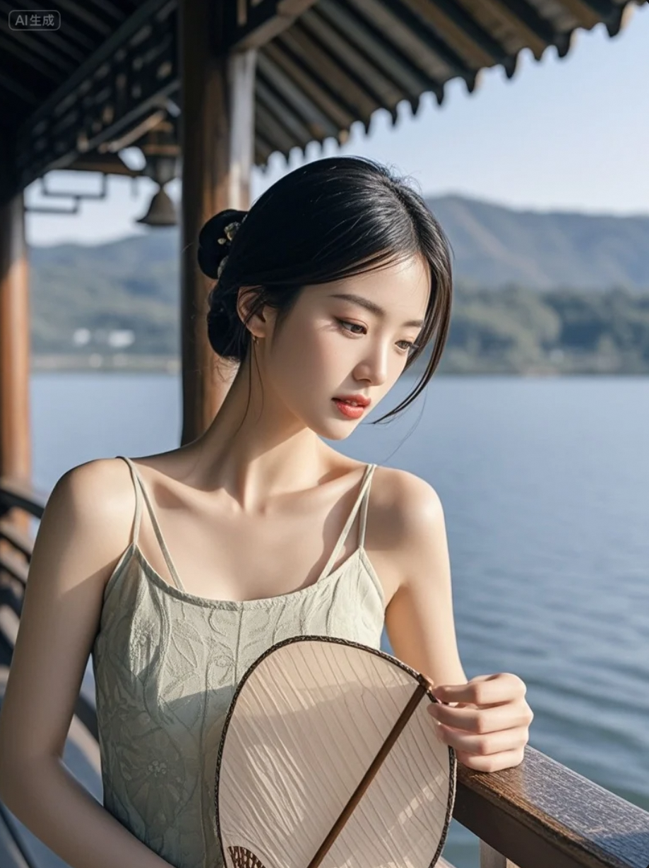 她不说话,只轻轻一扇,便搅动了整片湖光
