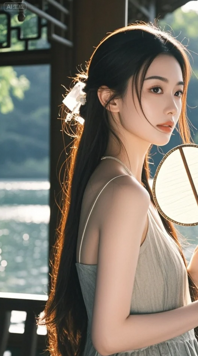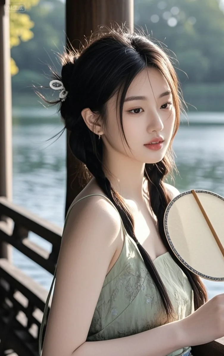 她不说话,只轻轻一扇,便搅动了整片湖光