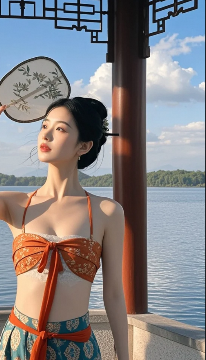 她不说话,只轻轻一扇,便搅动了整片湖光