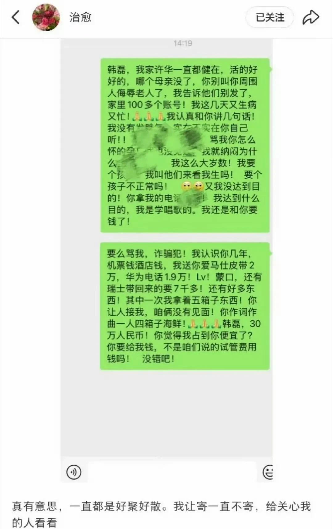 许凯出轨我忍了,年轻人谁还不犯个糊涂的时候。 但一把年纪的韩磊也犯这激情错误就不应该了,我觉得多年前看他夺冠《我是歌手》时说过,老婆陪他北漂,吃尽了苦,才来的时候,饭都吃不上。结果贤妻扶他青云志,他送贤妻顶绿帽子。 纪录片里,他的贤妻可漂亮了,高挑、苗条、一头齐腰长发。这男人是怎么回事啊!