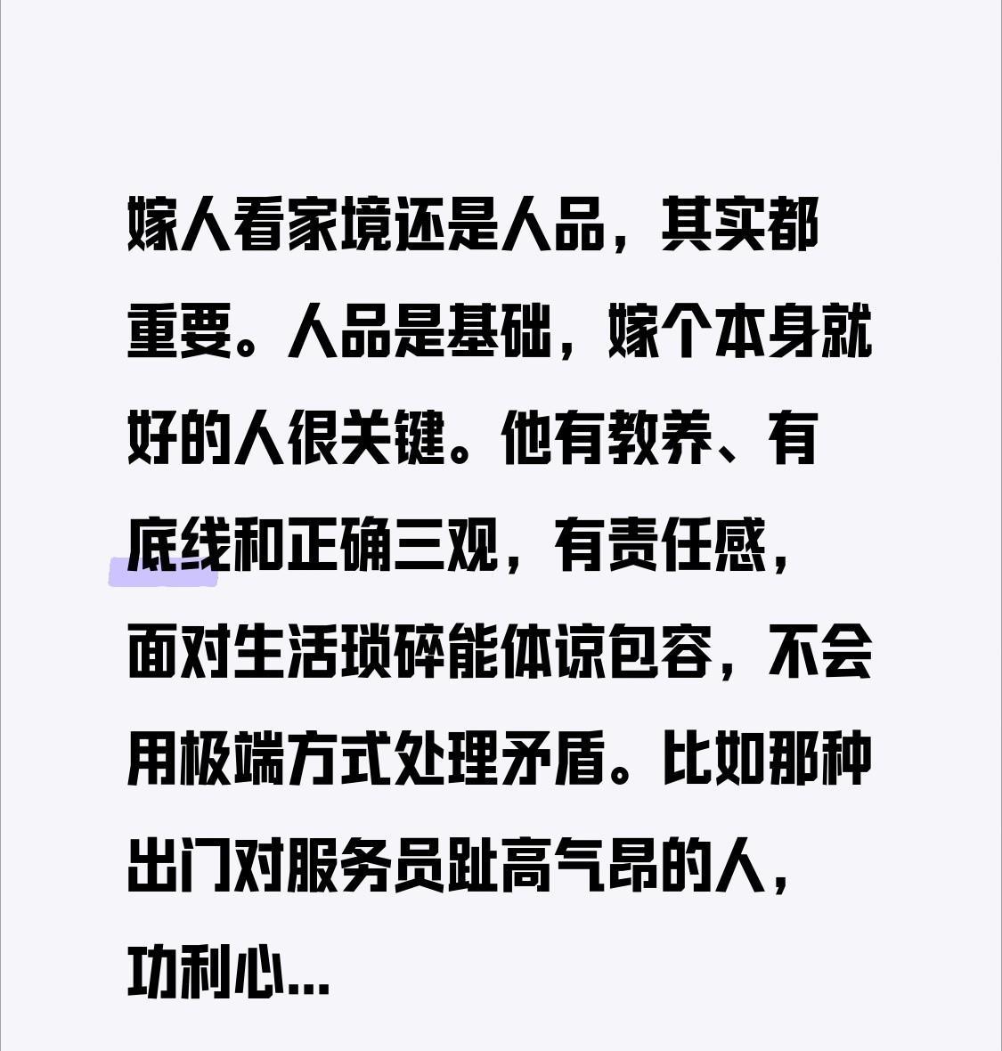 嫁人看家境还是人品,其实都重要。人品是基础,嫁个本身就好的人很关键。他有教养、有底线和正确三观,有责任感,面对生活琐碎能体谅包容,不会用极端方式处理矛盾。比如那种出门对服务员趾高气昂的人,功利心强,婚姻遇危机可能缺席。 而家境是加分项,经济基础能减少小家庭初始压力,良好的家庭氛围和成长环境也很重要。所以,嫁人要综合考量,两者共同支撑起家庭,婚姻才更有保障。