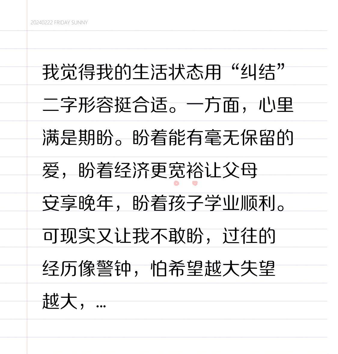 我觉得我的生活状态用“纠结”二字形容挺合适。 一方面,心里满是期盼。盼着能有毫无保留的爱,盼着经济更宽裕让父母安享晚年,盼着孩子学业顺利。可现实又让我不敢盼,过往的经历像警钟,怕希望越大失望越大,就像去年没抢到演唱会门票,那种失落至今难忘。 但我又不甘心完全放弃期盼,看到别人幸福相拥还是会羡慕。只能一边自我安慰顺其自然,一边在深夜里悄悄期待。这纠结的滋味,大概就是生活的常态吧。