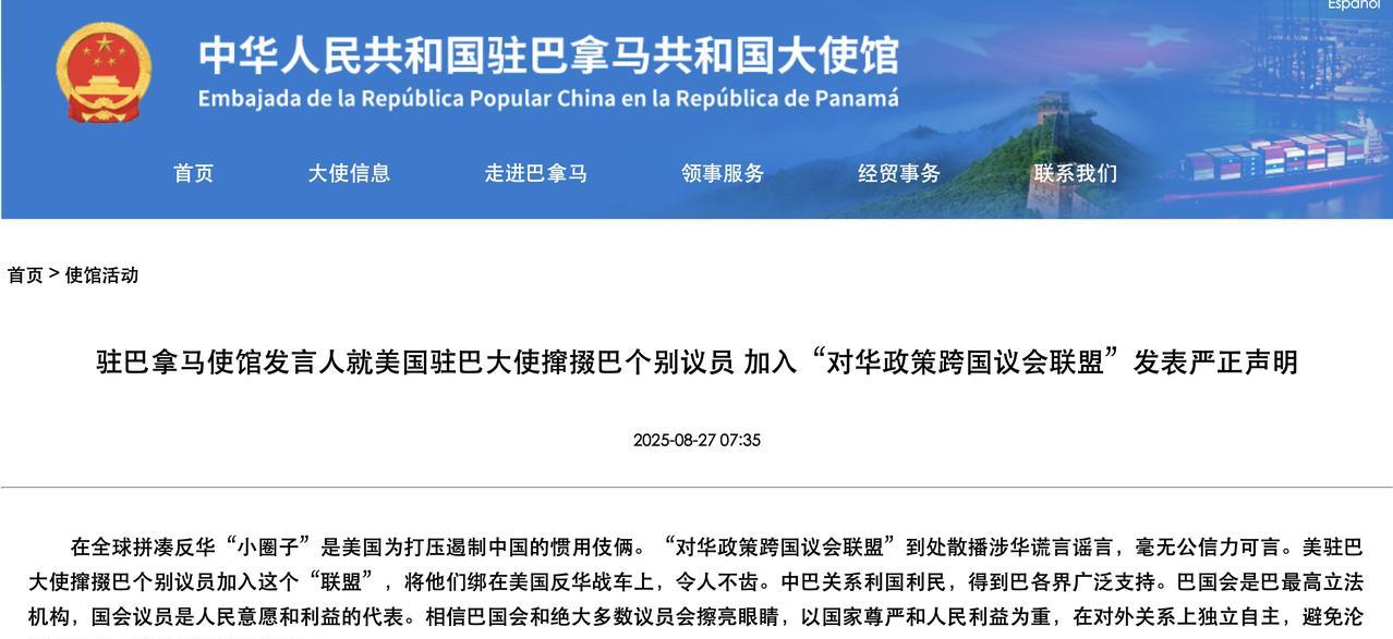 俄罗斯卫星通讯社 2025年8月27日, 10:54 多名巴拿马议员被美国驻巴拿马大使撺掇加入反华组织“对华政策跨国议会联盟”后,中国驻巴拿马大使馆8月27日发表严正声明谴责该行为,并称“将他们绑在美国反华战车上,令人不齿”。 美国驻巴拿马大使馆8月26日在社交媒体上发文称,美国驻巴拿马大使卡布雷拉当天与来自不同政党的巴拿马立法者,一同出席了他们加入“对华政策跨国议会联盟”的宣誓仪式。 据介绍,该联盟于2020年6月4日由美国、英国、日本、澳大利亚、加拿大、德国、挪威、瑞典八国的政客组织创立,旨在对抗中国,维护所谓的共同的民主价值观。 发言人指出,中巴关系利国利民,得到巴各界广泛支持。巴国会是巴最高立法机构,国会议员是人民意愿和利益的代表。相信巴国会和绝大多数议员会擦亮眼睛,以国家尊严和人民利益为重,在对外关系上独立自主,避免沦为服务美国地缘政治私利的棋子。 延伸阅读 中国驻巴拿马使馆发言人就美国驻巴大使撺掇巴个别议员 加入“对华政策跨国议会联盟”发表严正声明 中国驻巴拿马使馆官网 2025-08-27 07:35