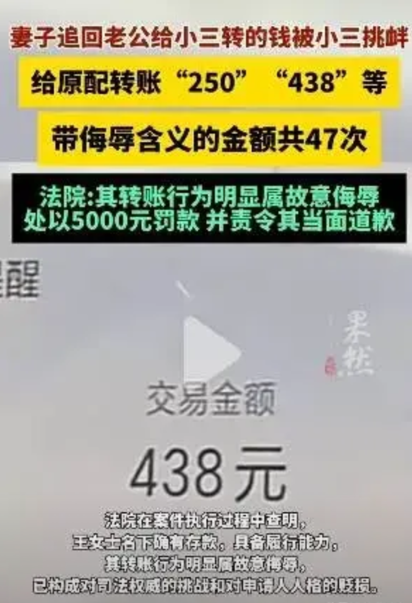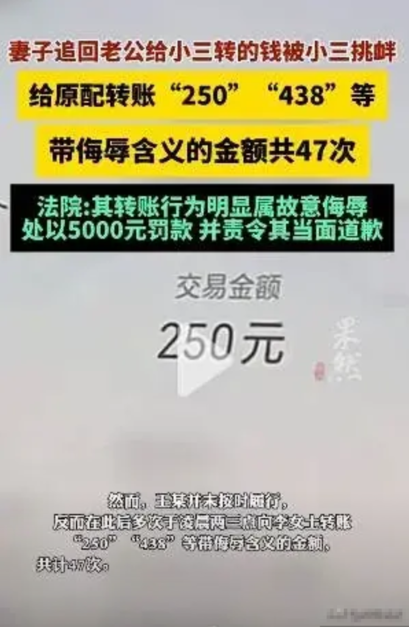 湖南宁乡,李女士发现丈夫杨某和王女士关系亲密,在婚姻续存期间,杨某多次给王女士转520元、1314元等大额红包,共25730元,当李女士上诉要求其返回时,王女士竟然拖着不给,还在凌晨转李女士250元、438元等红包达47次进行羞辱,网友不解:小三都如此疯狂了么?