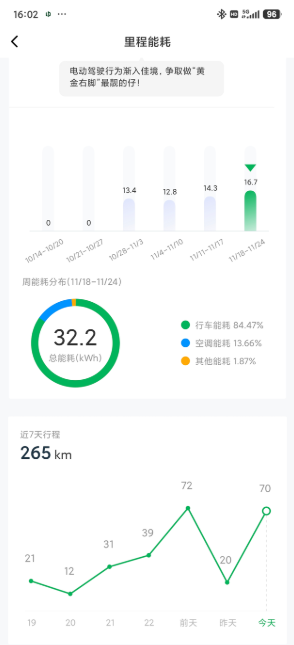 坐标湖北荆门,周末阴雨天,气温5-12℃,提前感受了一把冬季用车。充满电,标准续航530公里,动态续航440公里。 使用方式:提前10分钟备车,设置空调制热20℃,全程开制热20℃,刚开始开一小会除霜。开了四次,均采用上述方式。合计实跑里程162公里,标准里程消耗269公里,剩余261公里,标准续航达成率=162/269=60.22%; 动态里程消耗260公里,剩余180公里,动态续航达成率=162/260=62.23% 这样算来,和圈里的一位车友说的差不多,冬季满电续航大概在280公里左右。但是,没人会把电用干了再充电。也就是基本跑个200公里就差不多了, 强调一下 1.这是比较舒适的用车模式,上车就暖暖的 2.11月份大部分天气还是很舒适的,不开空调,动态续航基本能做到1:1,所以春秋续航应该还是很OK的。 3.感觉能耗和地形有很大关系。在平原地区(湖北钟祥)不开空调可以开到11-12KWh/100KM,但在荆门坡多,基本都是13-16KWh/100KM