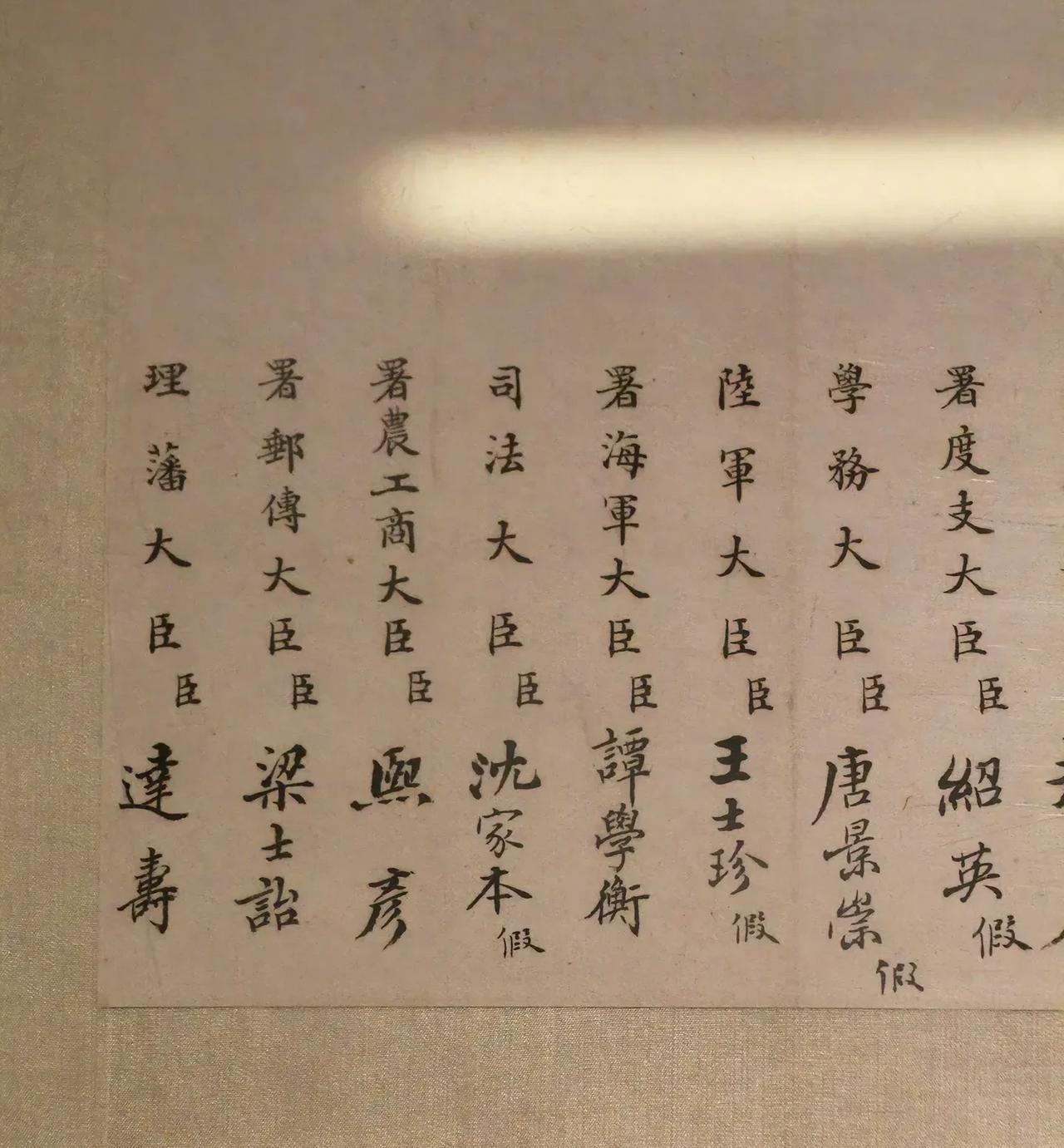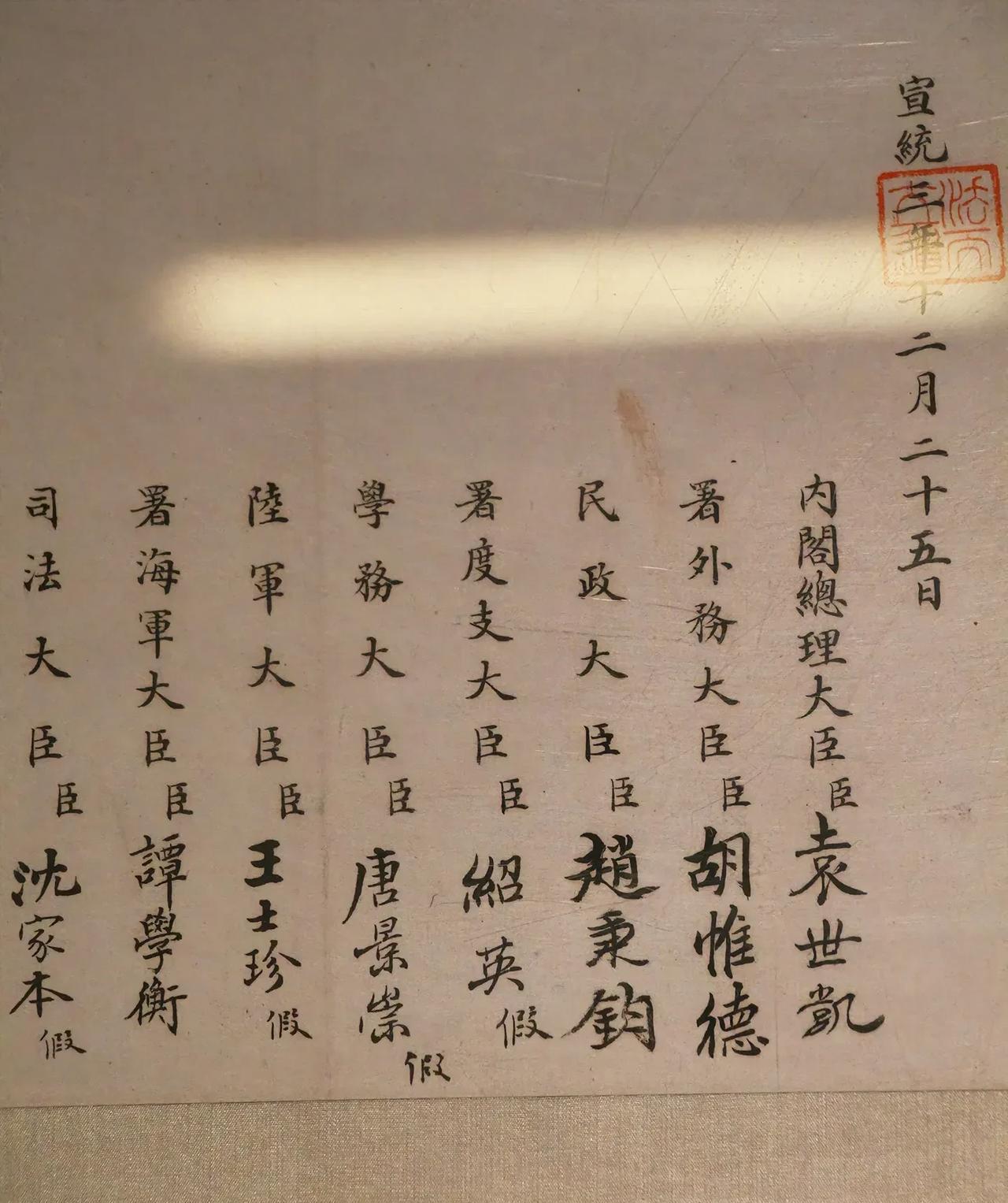 溥仪退位诏书 1912年2月12日,清朝末代皇帝溥仪颁布退位诏书,这一诏书的颁布宣告了中国两千多年帝制的终结。该诏书是由袁世凯主导拟定的,并且由内阁大臣共同联署。在诏书中,“满蒙回藏待遇八条”旨在维护民族关系,而“皇帝只是卸下政权,尊号并不废除,陵寝永远供奉”这一情况,实际上是一场政治博弈后的妥协。需要注意的是,在签署大臣里,沈家本、绍英等人名字后的“假”(代理)字频繁出现,这反映出清朝末年官僚体系的瓦解崩溃。